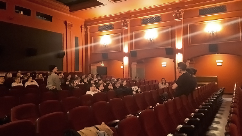 Członkowie Szkolnego Klubu Filmowego na pokazie filmu w kinie Muranów