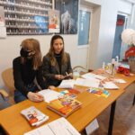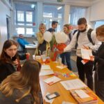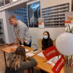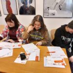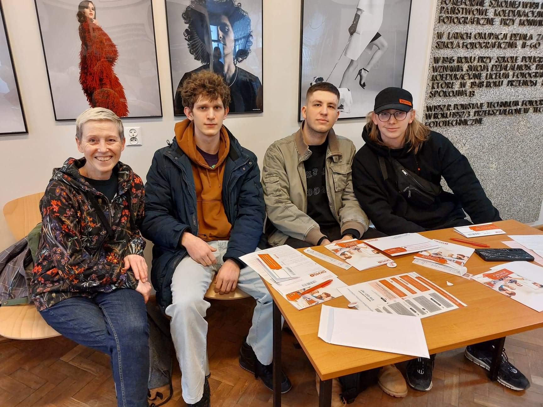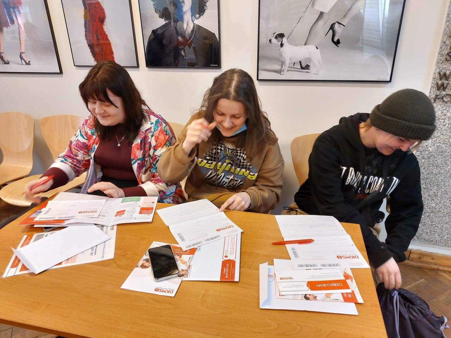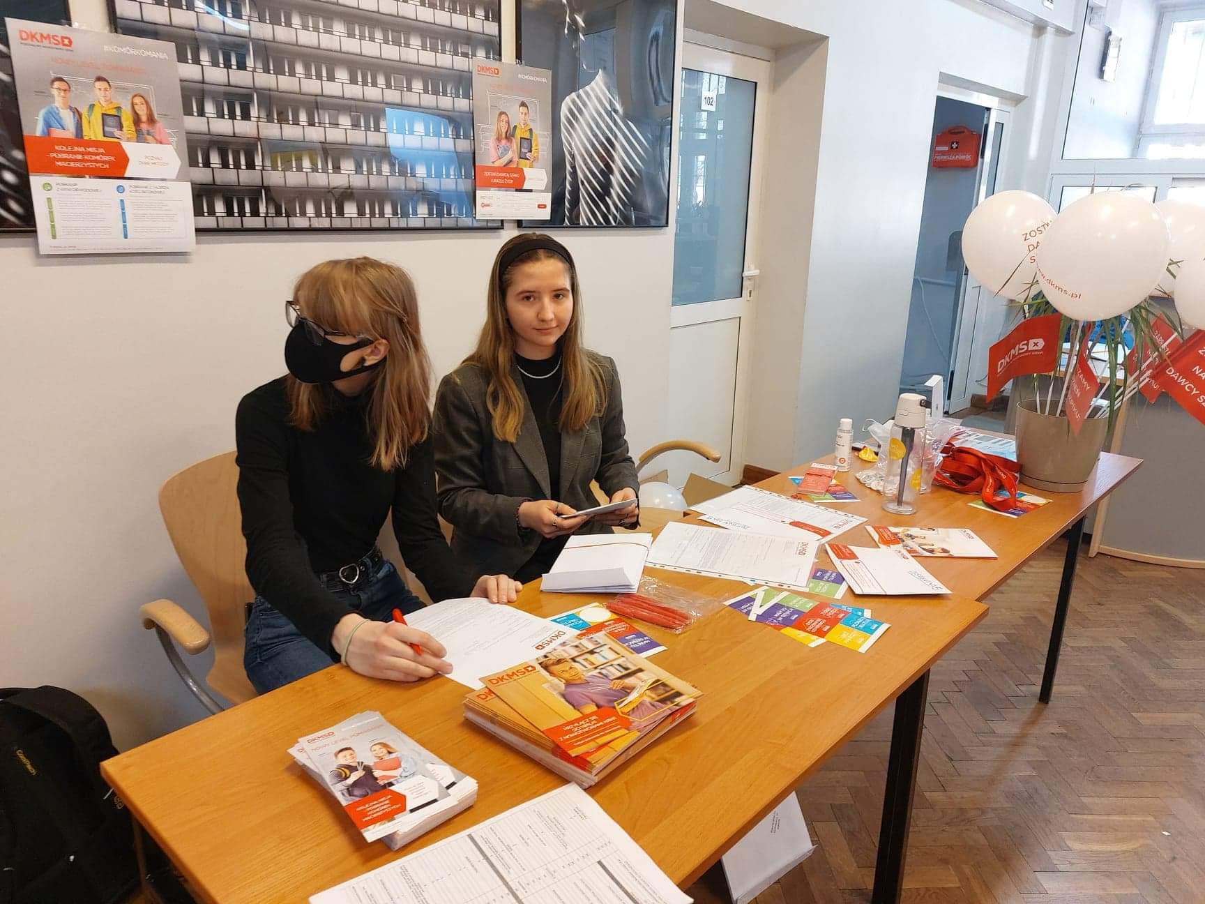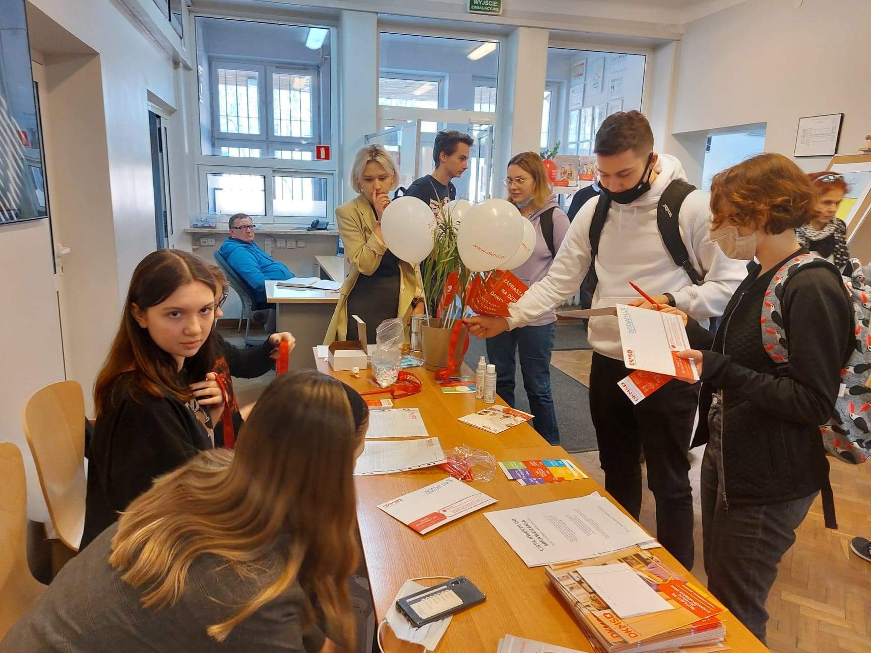 Kilkoro młodych ludzi stoi przy stole, przy którym prowadzone są zapisy Przy stole siedzą trzy osoby zapisujące do akcji. Na stole leżą dokumenty Czworo uczniów siedzi przy stole, na którym leżą dokumenty Dwie uczennice siedzą przy stole, na którym leżą dokumenty i kolorowe ulotki Dwie dziewczyny siedzą przy stole, chłopak stoi opierając się rękami o stół