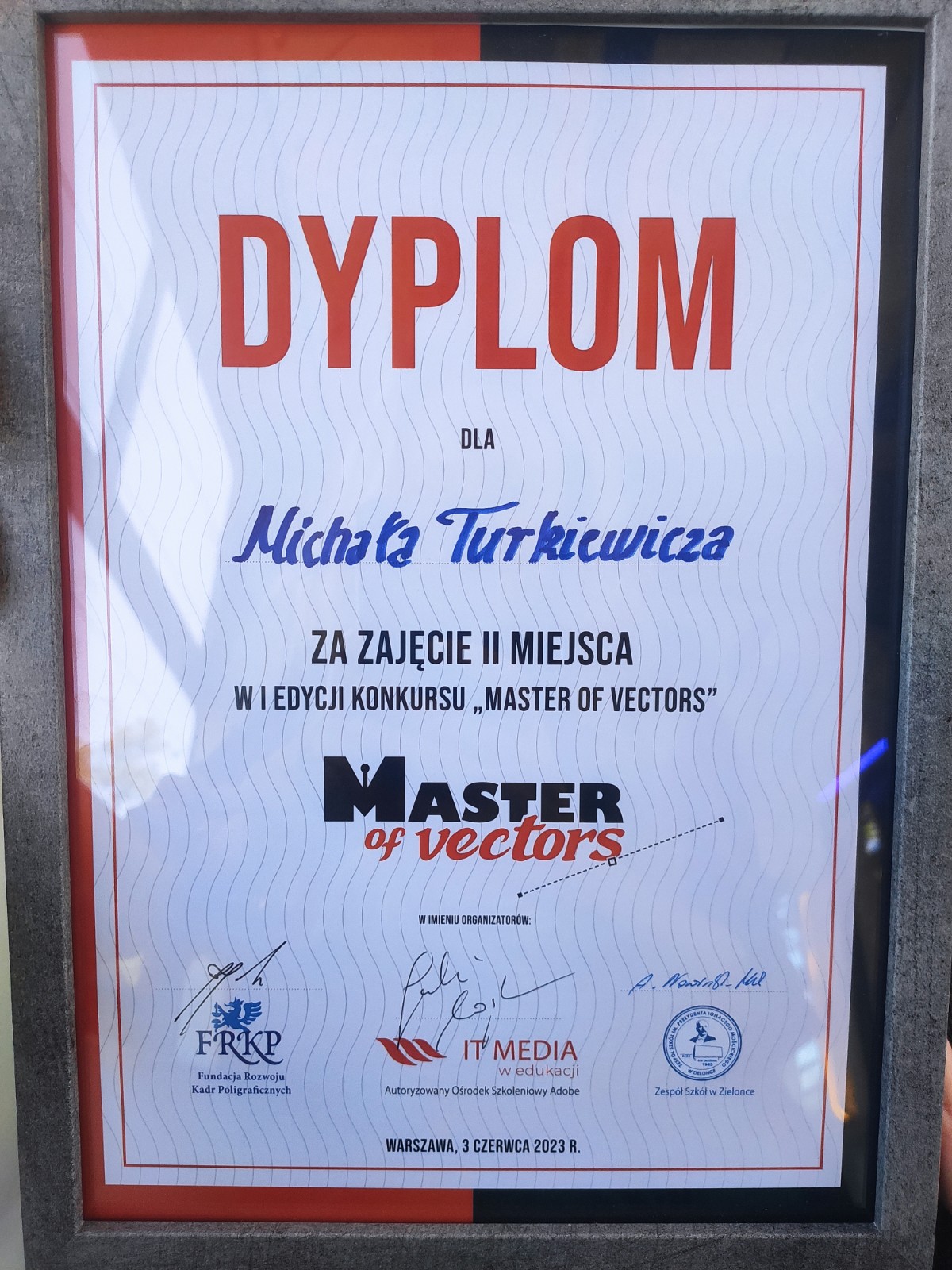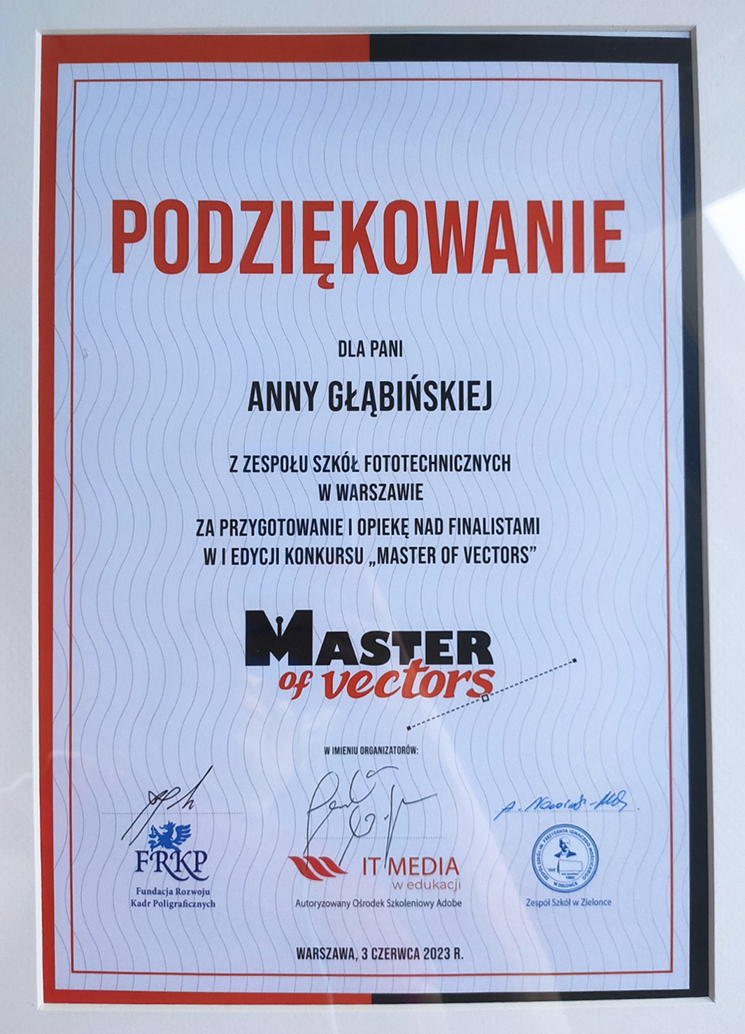 3 czerwca 2023 w siedzibie firmy IT-Media w Warszawie odbył finał międzyszkolnego konkursu graficznego „Master of Vectors”. ZSF reprezentowało w nim z sukcesem dwoje uczniów: