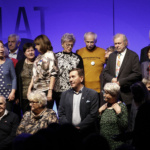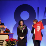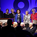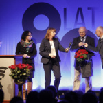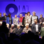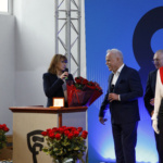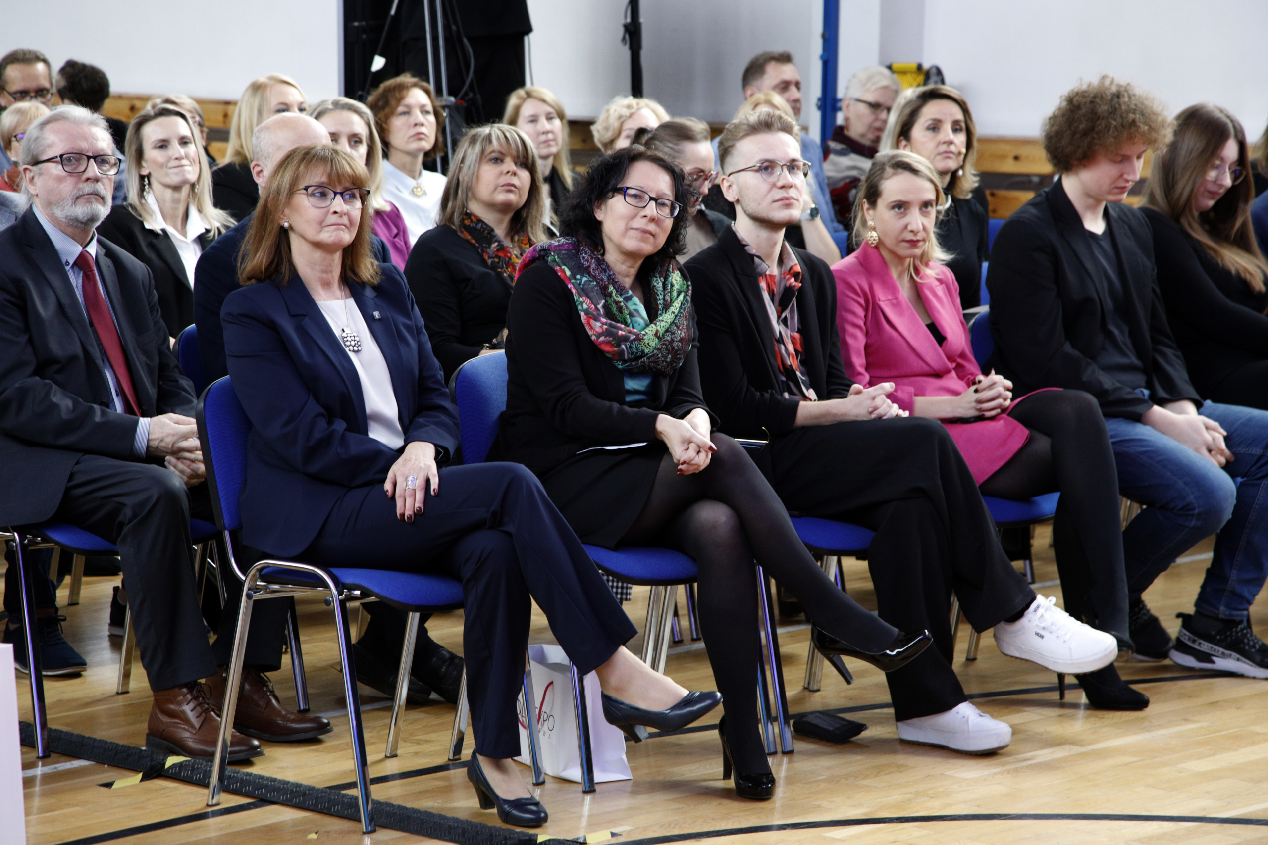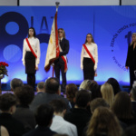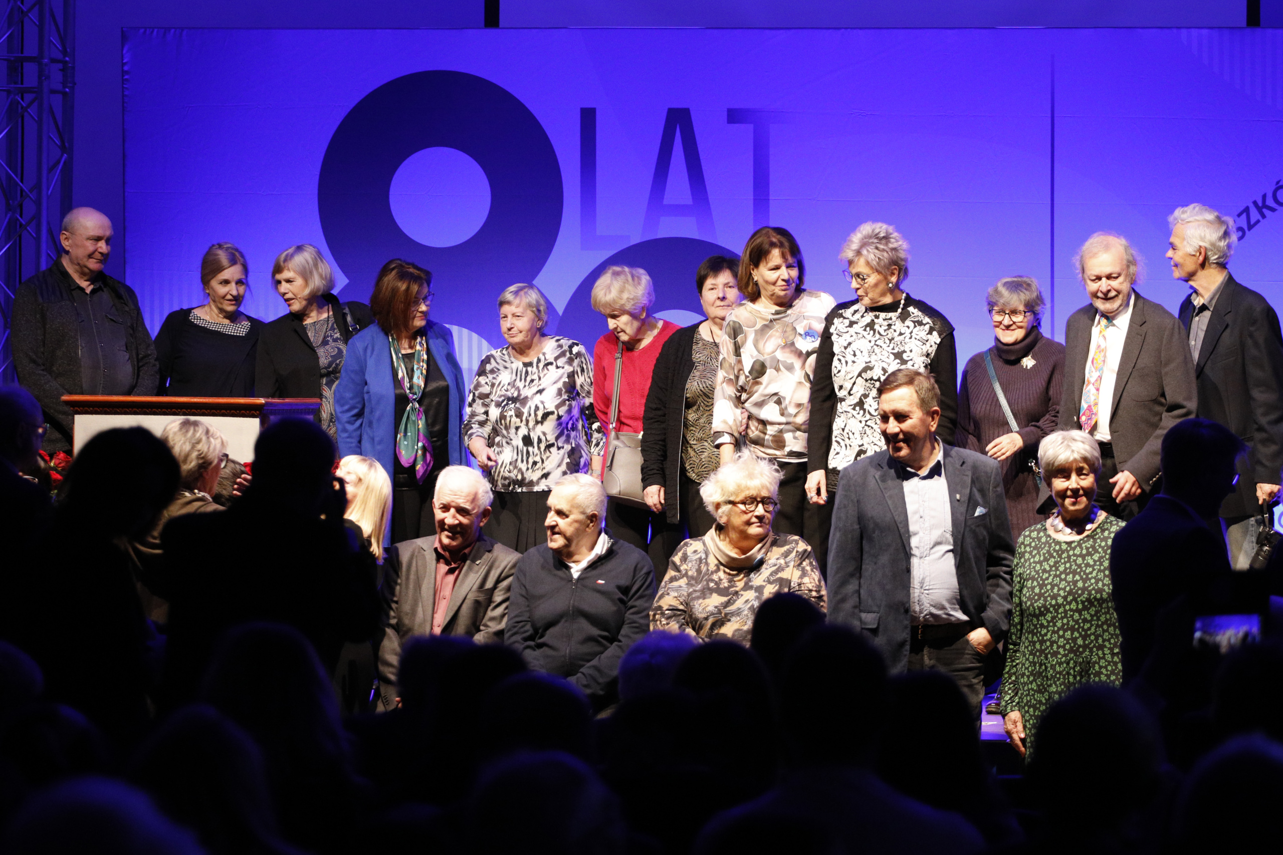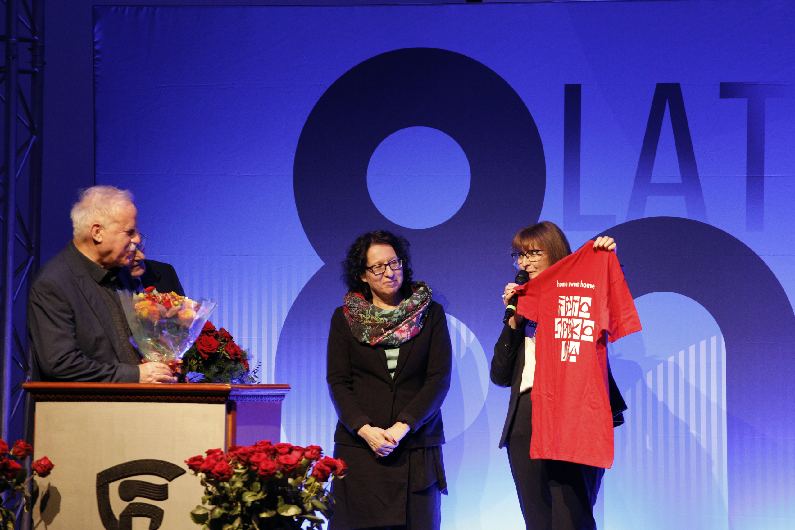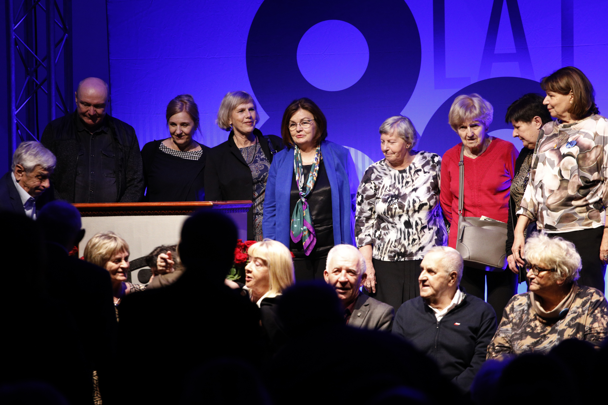 Pani Dyrektor zaprosiła wszystkich emerytowanych pracowników na scenę, gdzie otrzymali piękne róże i zapozowali do pamiątkowego zdjęcia. Po tym miłym wydarzeniu głos zabrała absolwentka, która ZSF ukończyła 64 lata temu. Poprosiła o uczczenie minutą ciszy tych absolwentów i nauczycieli, których nie ma już wśród nas. Kolejny absolwent, maturzysta z 65 roku w krótkim wystąpieniu podkreślił, że spotkania jubileuszowe są formą przekazywania pałeczki, sztafety pokoleń.