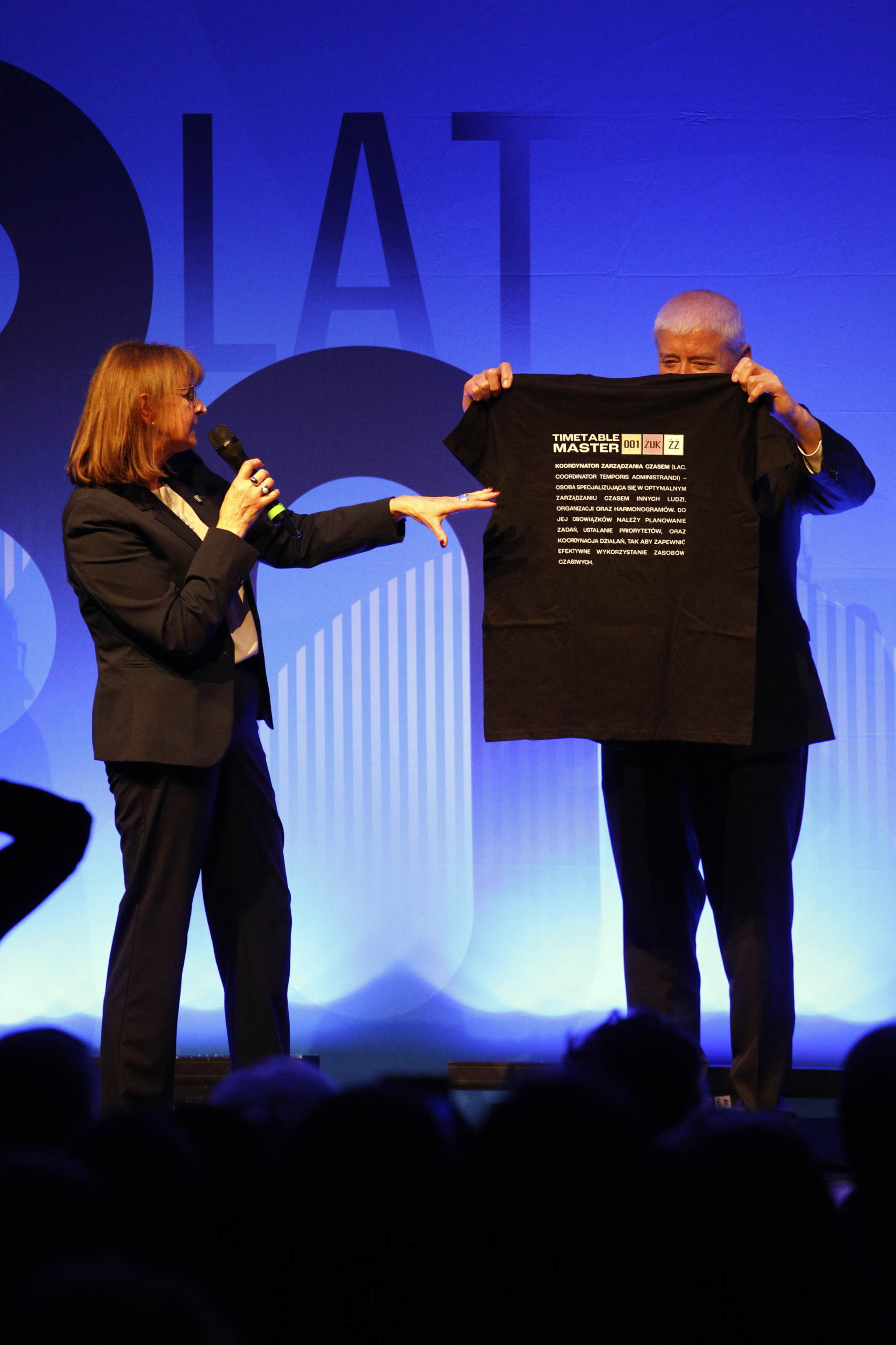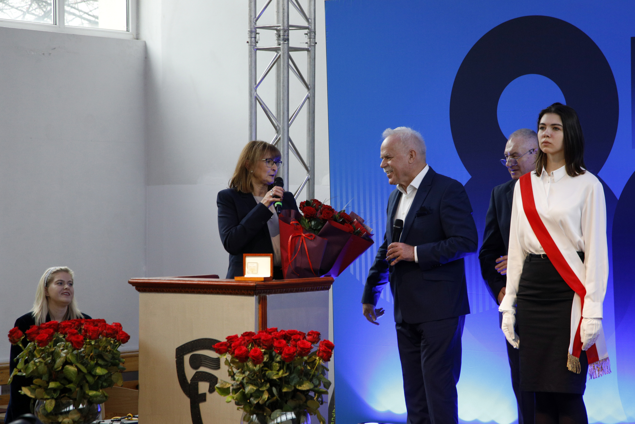 Po przemówieniu Pani Dyrektor zabrał głos przedstawiciel Samorządu uczniowskiego Bartosz Sasinowski, który powitał zebranych gości. Na scenę zostali zaproszeni byli dyrektorzy ZSF pan Dariusz Przetacki oraz pan Edward Habas, którzy otrzymali kwiaty i pamiątkowe upominki. Pamiątkową koszulkę otrzymał również nauczyciel – legenda naszej szkoły pan Roman Żukowski.