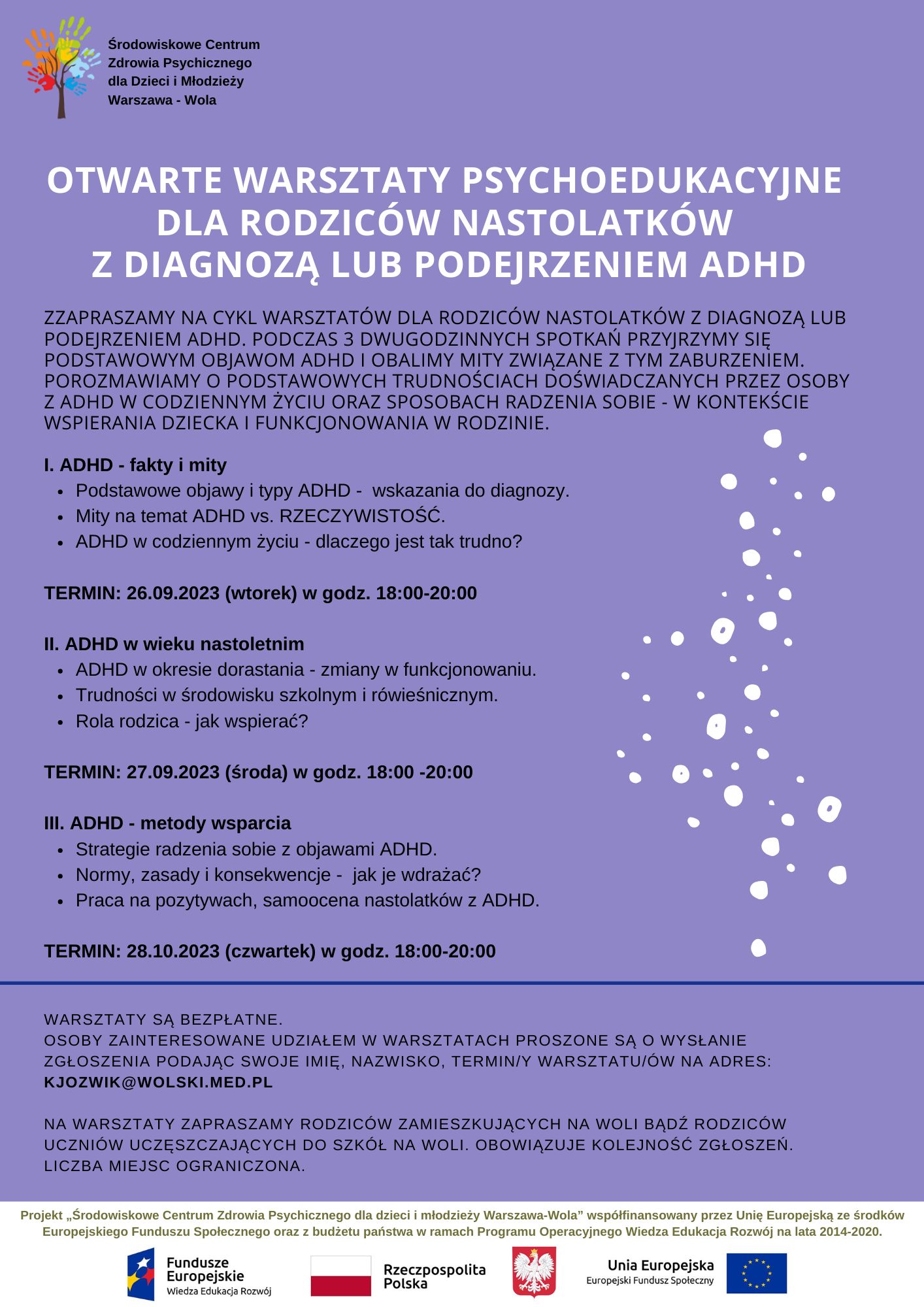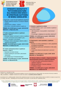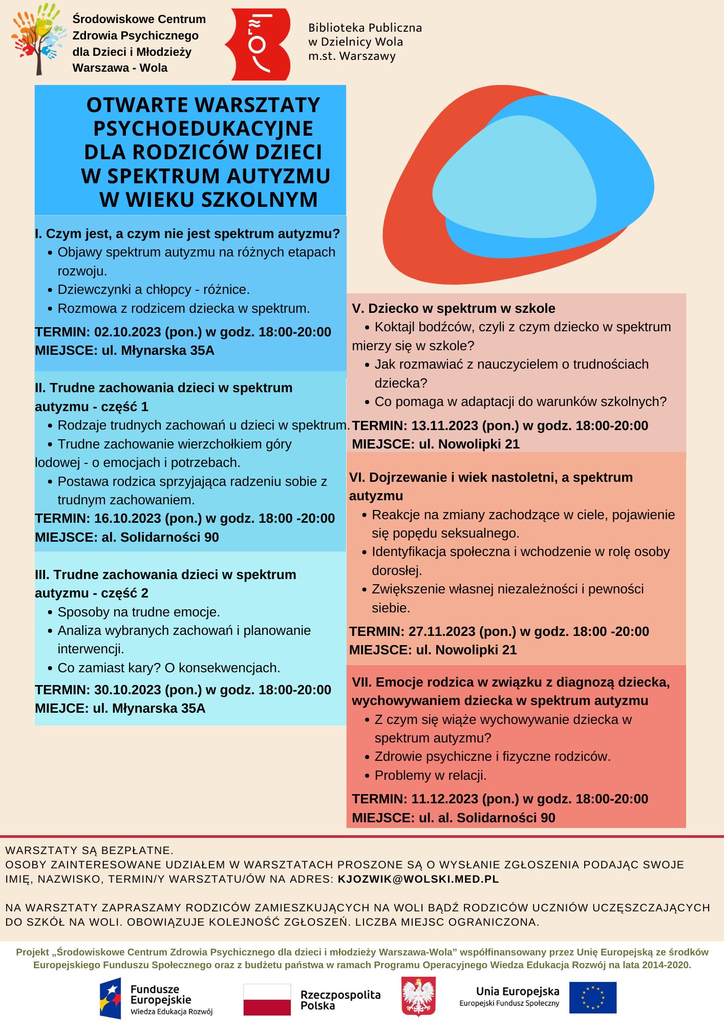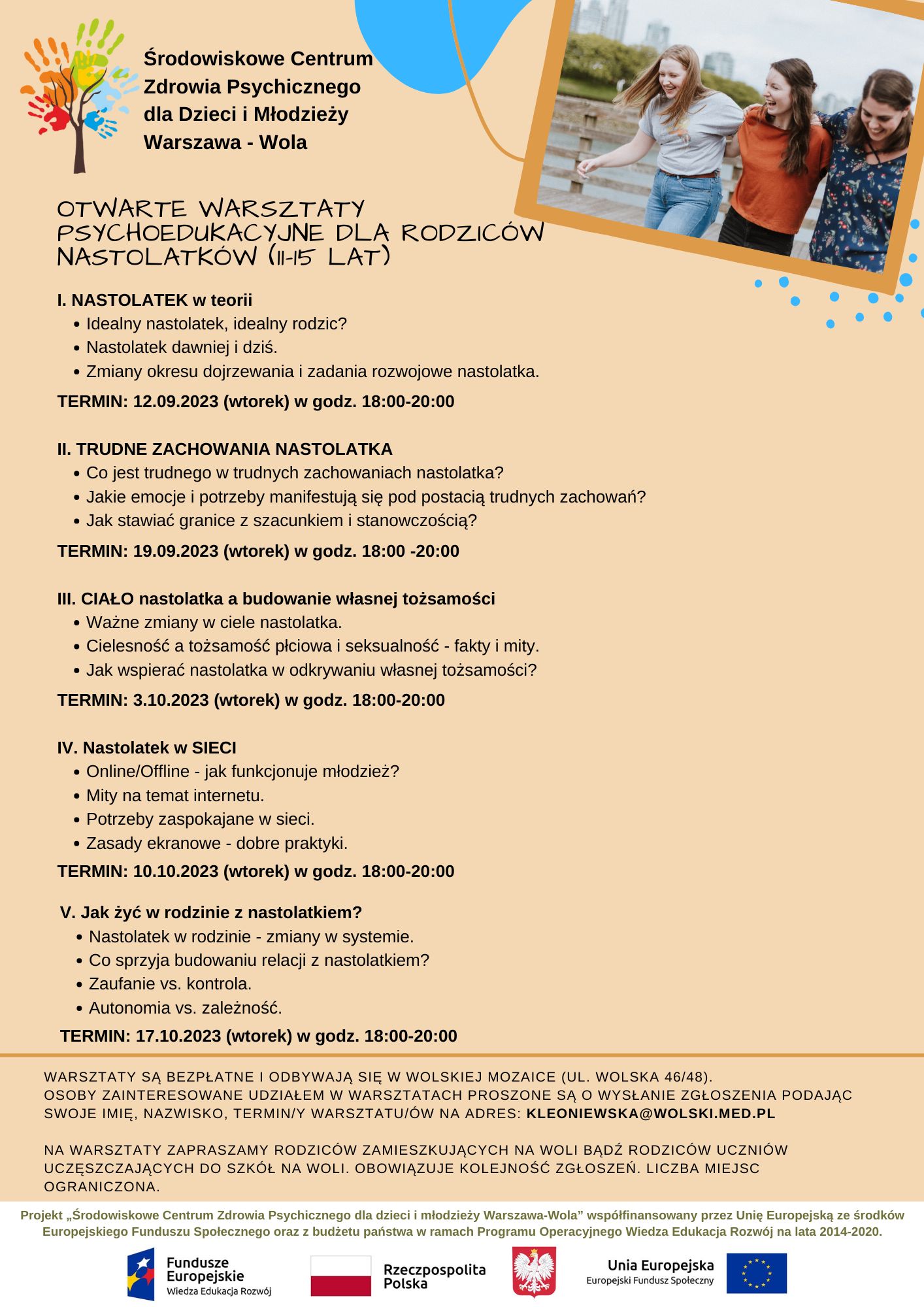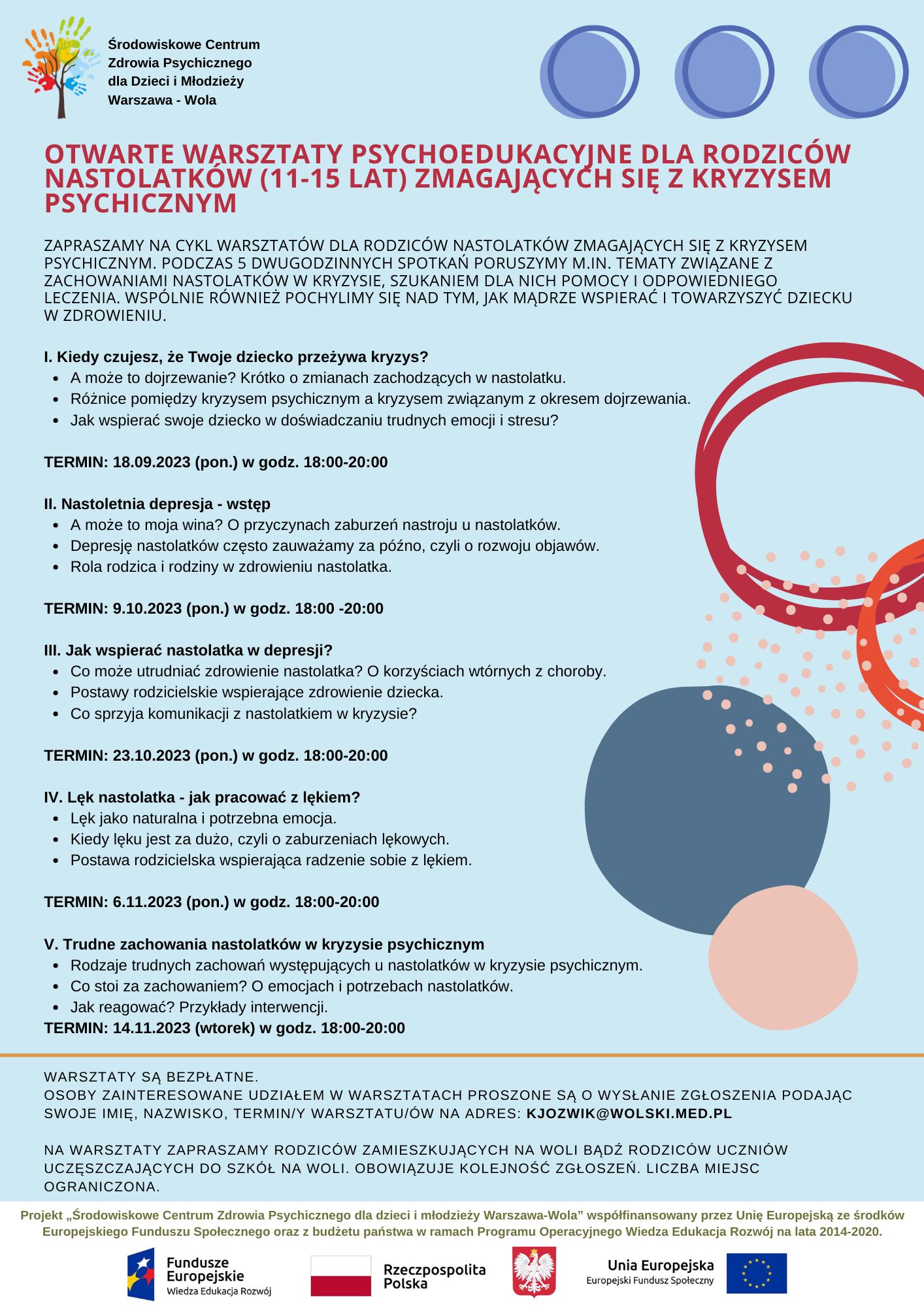 Serdecznie zapraszamy Rodziców do wzięcia udziału w warsztatach psychoedukacyjnych realizowanych przez Środowiskowe Centrum Zdrowia Psychicznego dla Dzieci Młodzieży Warszawa-Wola. Tematyka, terminarz warsztatów i dane do kontaktu znajdują się na załączonych plakatach. Zachęcamy do udziału.
