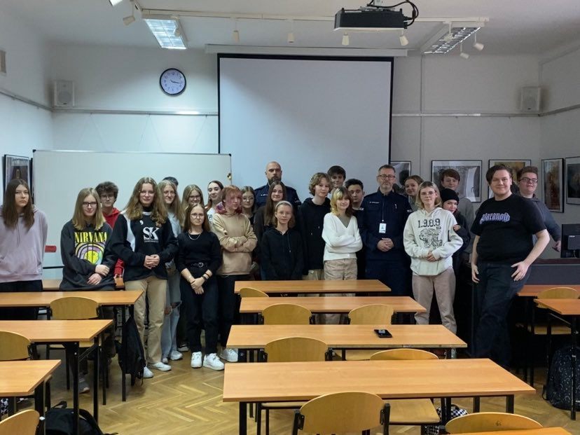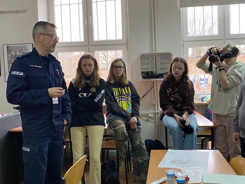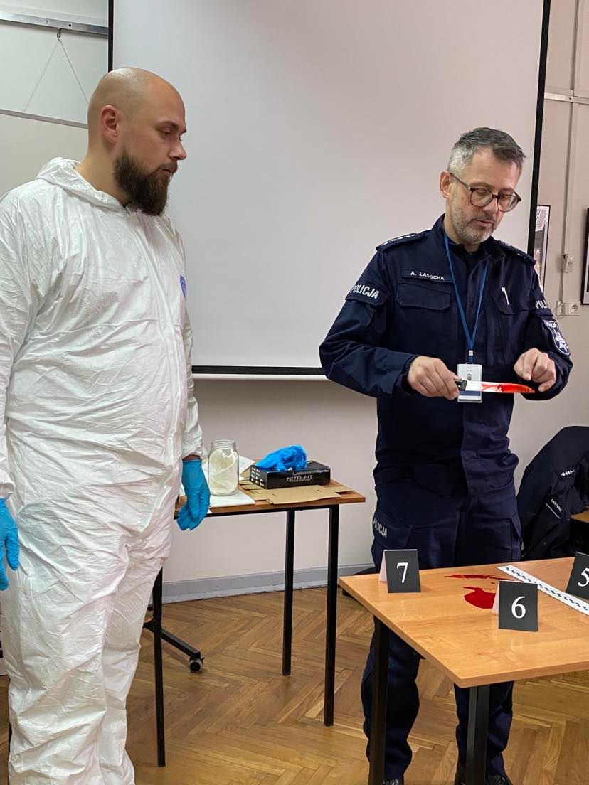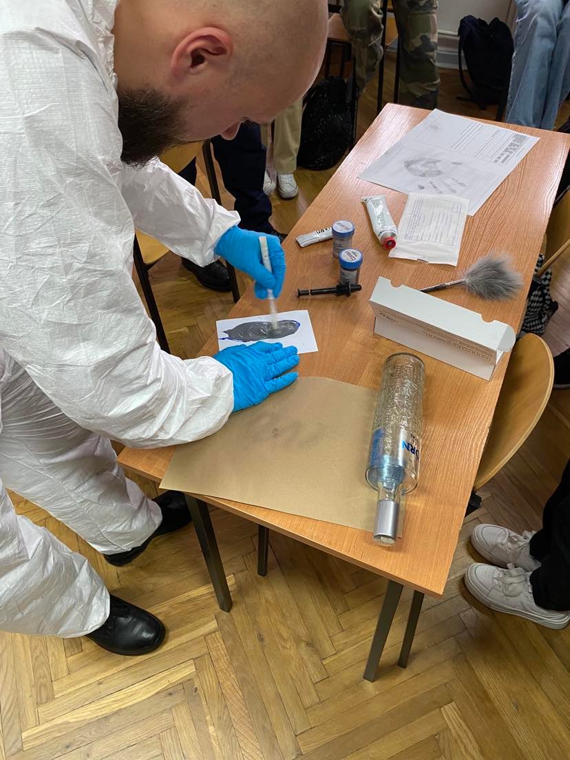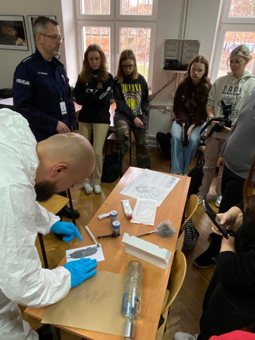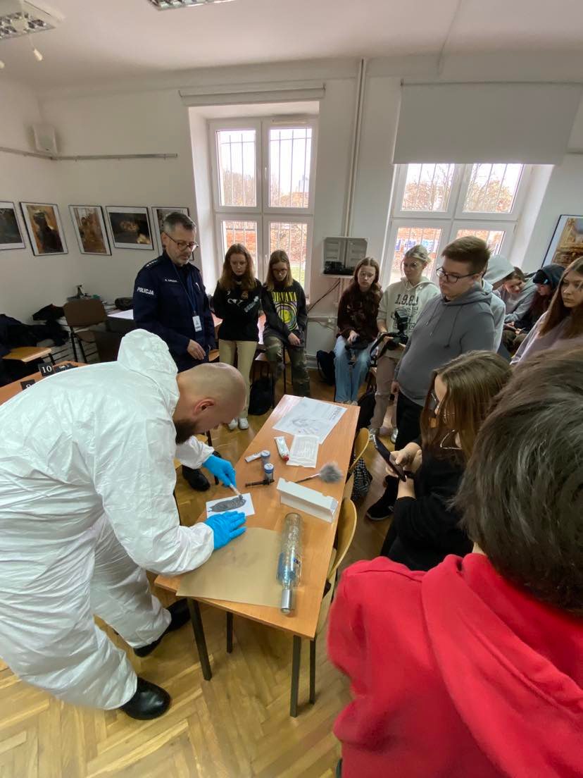 Policjanci z Zakładu Szkoleń Specjalnych Centrum Szkolenia Policji w Legionowie zapoznali młodzież z technicznymi aspektami zabezpieczania śladów na miejscu zdarzenia, daktyloskopowaniem osób oraz zabezpieczaniem śladów biologicznych. Przybliżyli także uczniom rodzaje fotografii kryminalistycznej, charakterystyczne metody jej wykonywania oraz wymogi warsztatowe. Uczniowie dowiedzieli się, że w technikach kryminalistycznych nie stosuje się obróbki komputerowej, a dąży do wiarygodnego i jak najwierniejszego utrwalenia obiektów i miejsc unikając zniekształceń perspektywicznych oraz stosując duży zakres głębi ostrości.