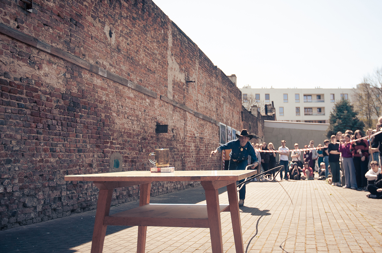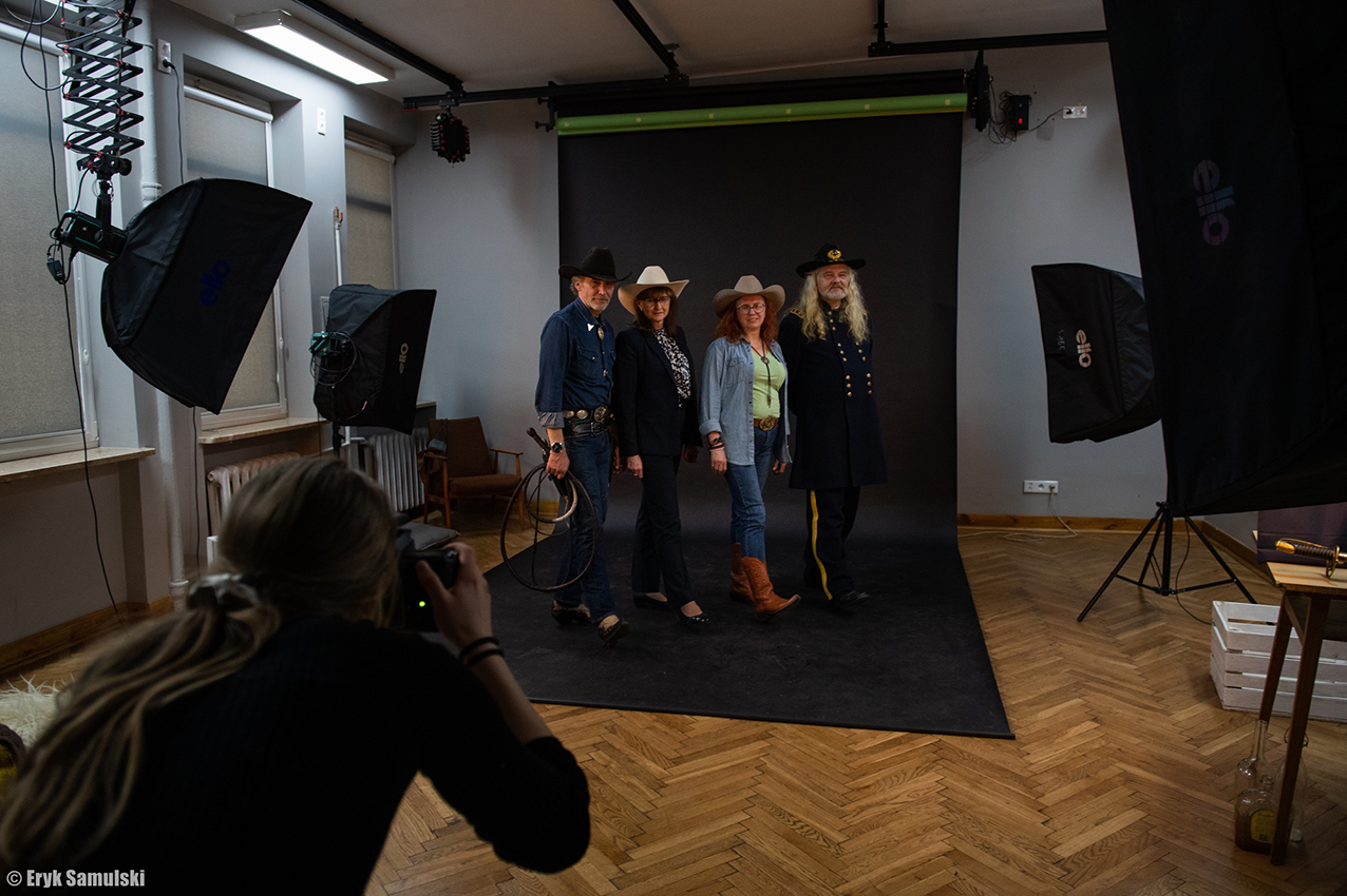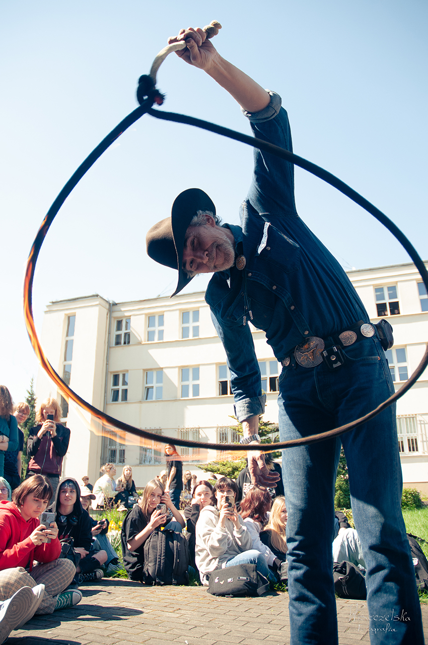 Z okazji kwietniowego Dnia Fotografii na patio szkolnym odbył się pokaz w stylu western w wykonaniu Ghosts Raiders Saloon z Poznania. Uczniowie mieli okazję na żywo zobaczyć umiejętności lidera grupy Alberta Neumanna – mistrza świata w posługiwaniu się biczem 2022r. Po pokazie zaprosiliśmy naszych gości na sesje portretowe.
