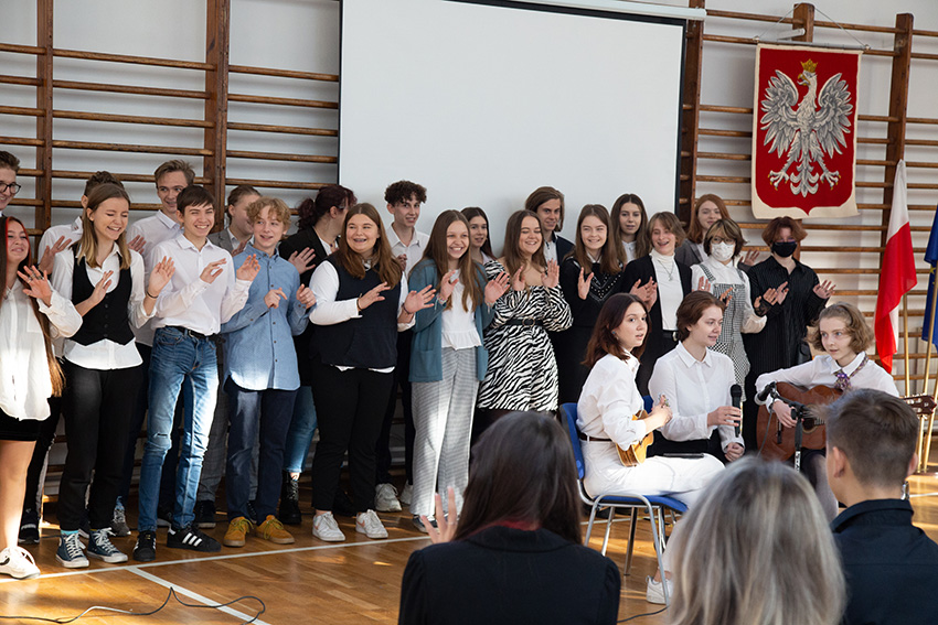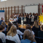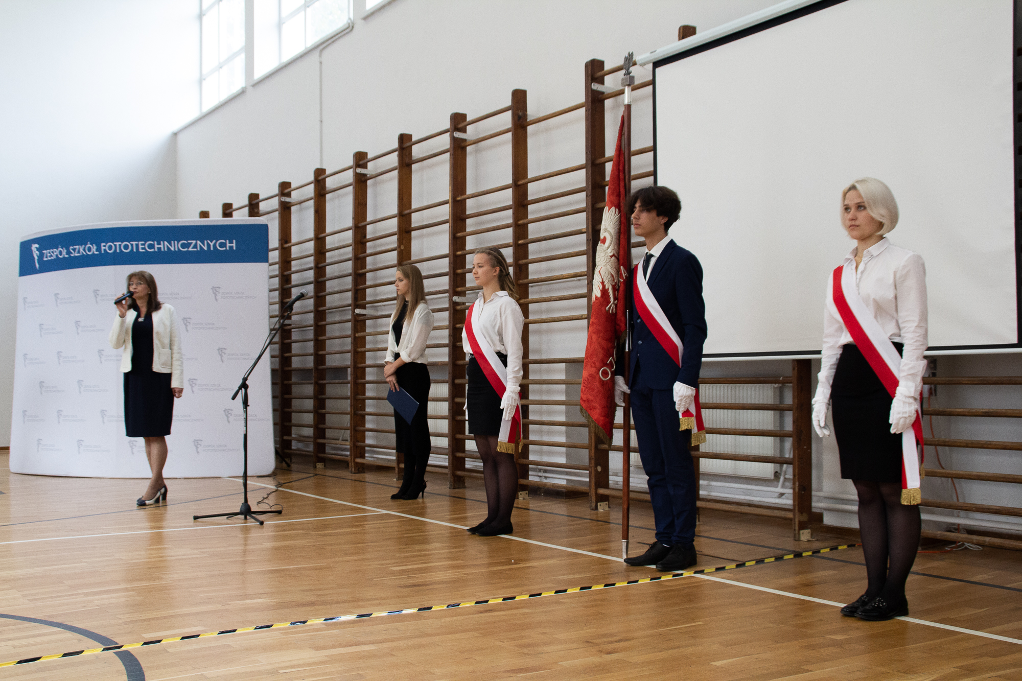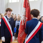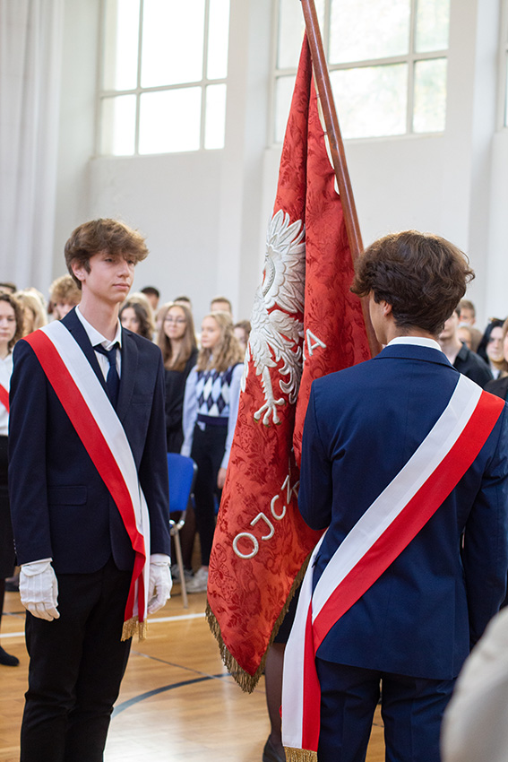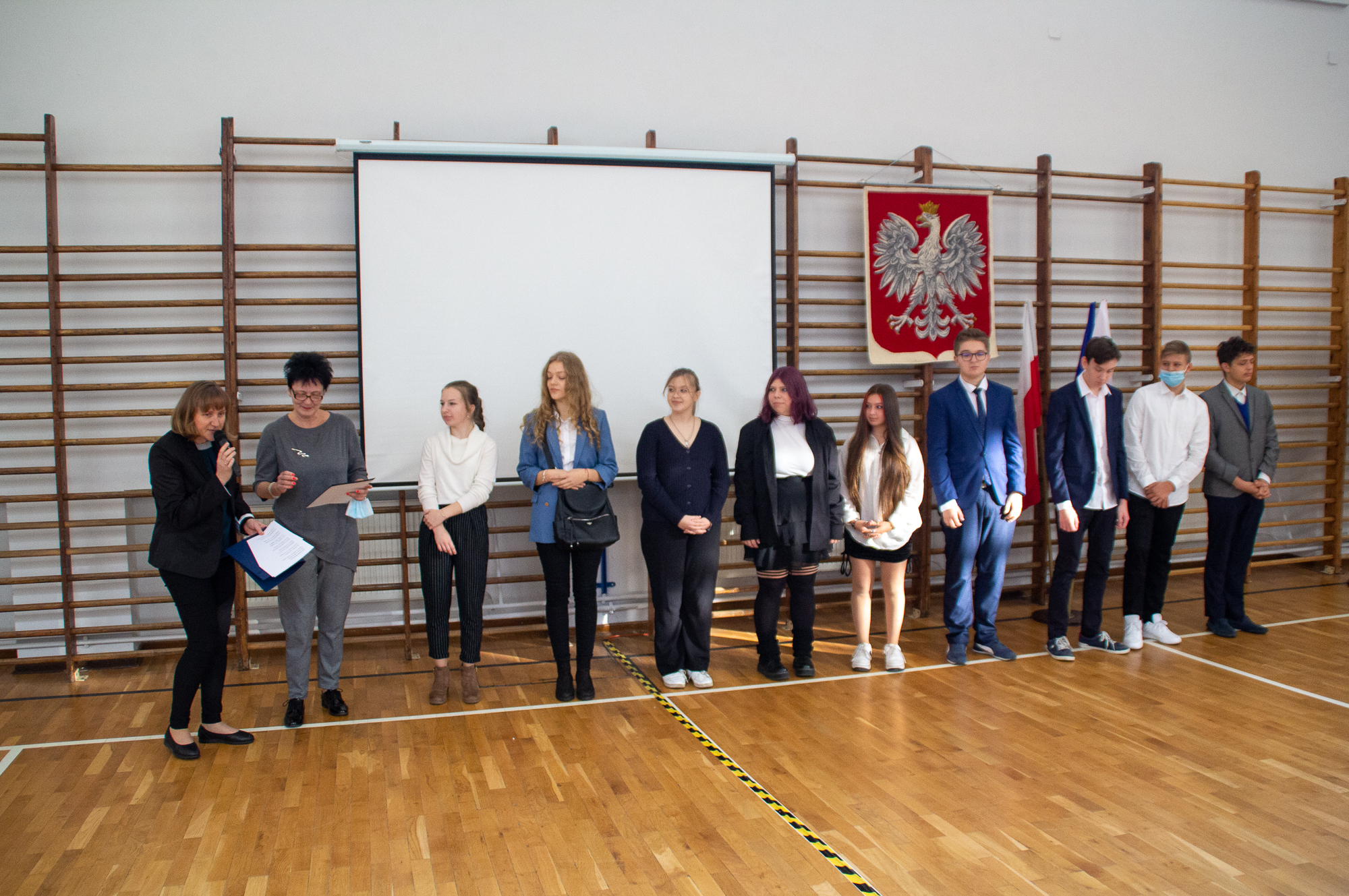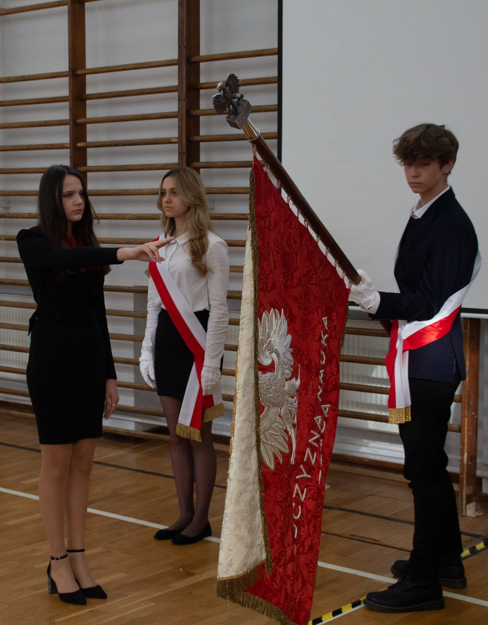 Czekało na nich nie tylko uroczyste ślubowanie na sztandar szkoły, ale także konkursy i zabawy przygotowane specjalnie dla nich przez starszych kolegów. Poza tym każda klasa miała możliwość dokonania autoprezentacji, także wszyscy mieli okazję obejrzeć ich przygotowane występy oraz nagrane filmiki. Wszystkie zadania były oceniane przez jurorów, którzy na koniec zmagań wyłonili zwycięski zespół – klasę 1CAN. Tego dnia rozstrzygnięty został także konkurs dla klas pierwszych na najlepszą rymowankę pt. „Nauka zdalna”. Wygrani mogli odczytać swoje dzieła przed wszystkimi zebranymi, za co nagrodzeni zostali wielkimi brawami oraz słodkimi upominkami. Wielkim zaszczytem jest bycie członkiem Pocztu Sztandarowego i czternastego października wszyscy obejrzeliśmy uroczyste przekazanie sztandaru naszej szkoły. Ustępujący Poczet – tegoroczni maturzyści przekazali tę zaszczytną funkcję reprezentantom klas drugich. Jesteśmy pewni, że będą ją pełnić równie dobrze jak starsi koledzy.