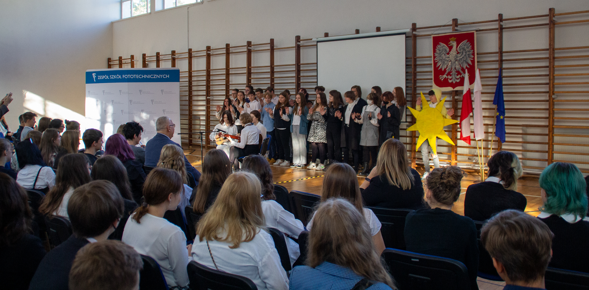 Dzień Nauczyciela jak co roku w naszej szkole był okazją do wielkiego święta. Tego dnia uczniowie klas pierwszych zostali oficjalnie przyjęci do społeczności Fotospokojnej. Pierwszoklasiści wraz z wychowawcami zostali powitani przez panią dyrektor oraz uczniów starszych klas na uroczystości w sali gimnastycznej.