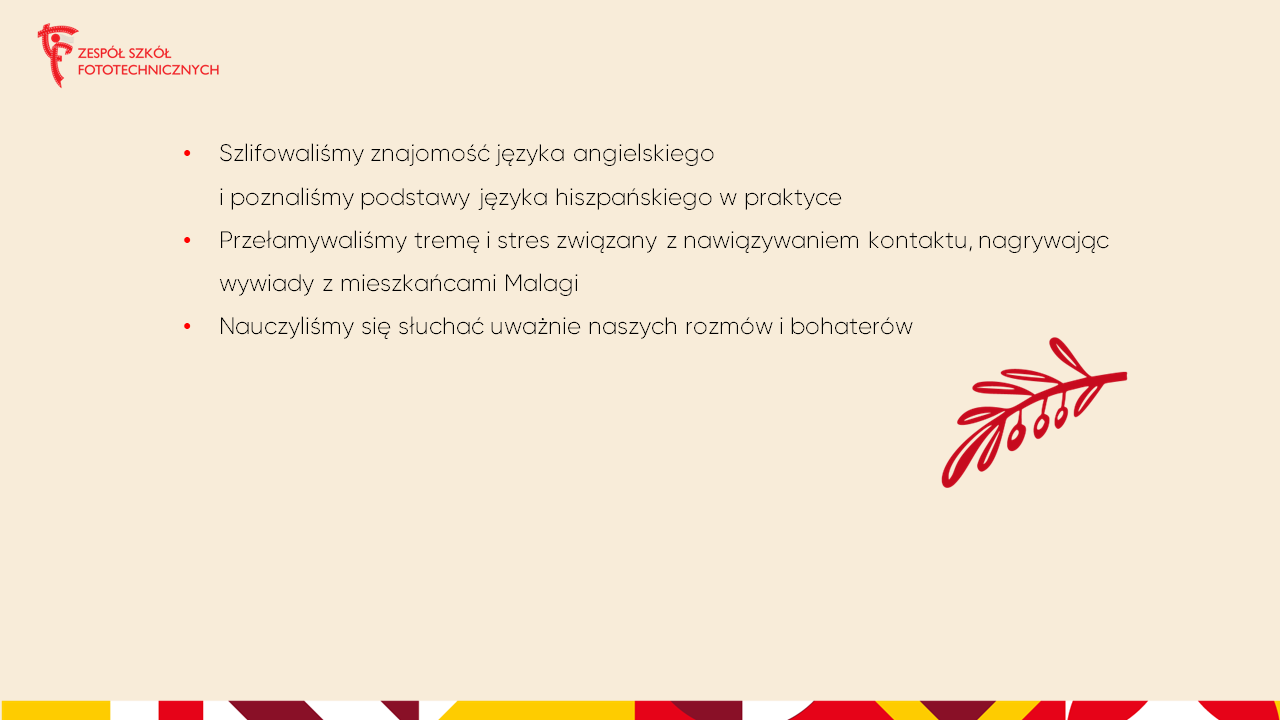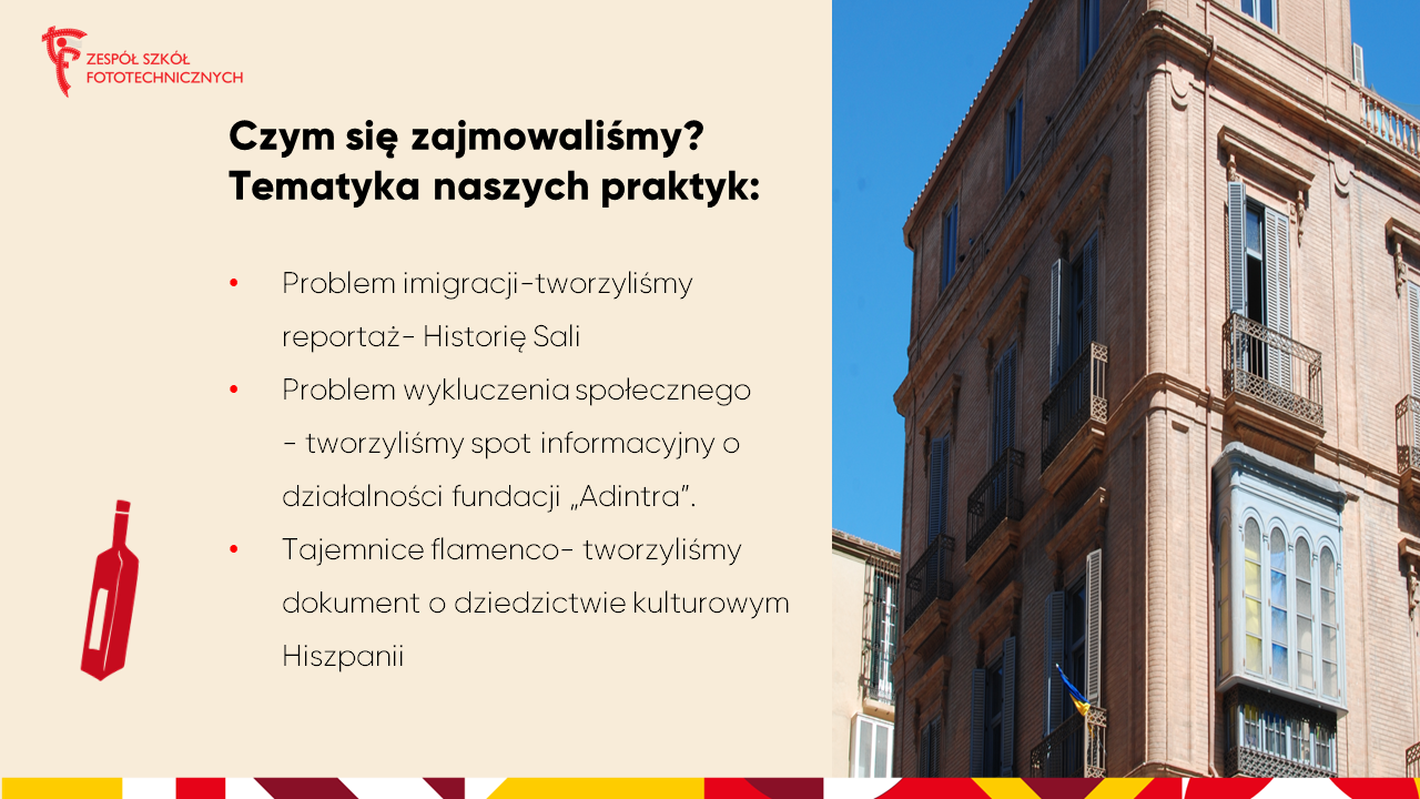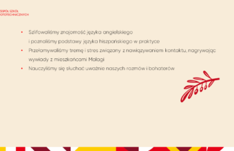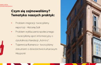 Pokazano prezentację, w której znalazły się najważniejsze informacje dotyczące programu praktyk zawodowych Erasmus+, dzięki którym przyszli kandydaci do udziału w podobnych projektach dowiedzieli się między innymi: na czym polegał proces rekrutacyjny, jakie były cele projektu i sposób jego organizacji. Poznali tematykę realizowanych w Maladze zajęć i partnerów projektu. Przekonali się o tym, jak wiele korzyści przyniósł uczestnikom udział w praktykach, zarówno na polu rozwijania kompetencji zawodowych, warsztatu pracy filmowca, jak i cennych umiejętności społecznych.