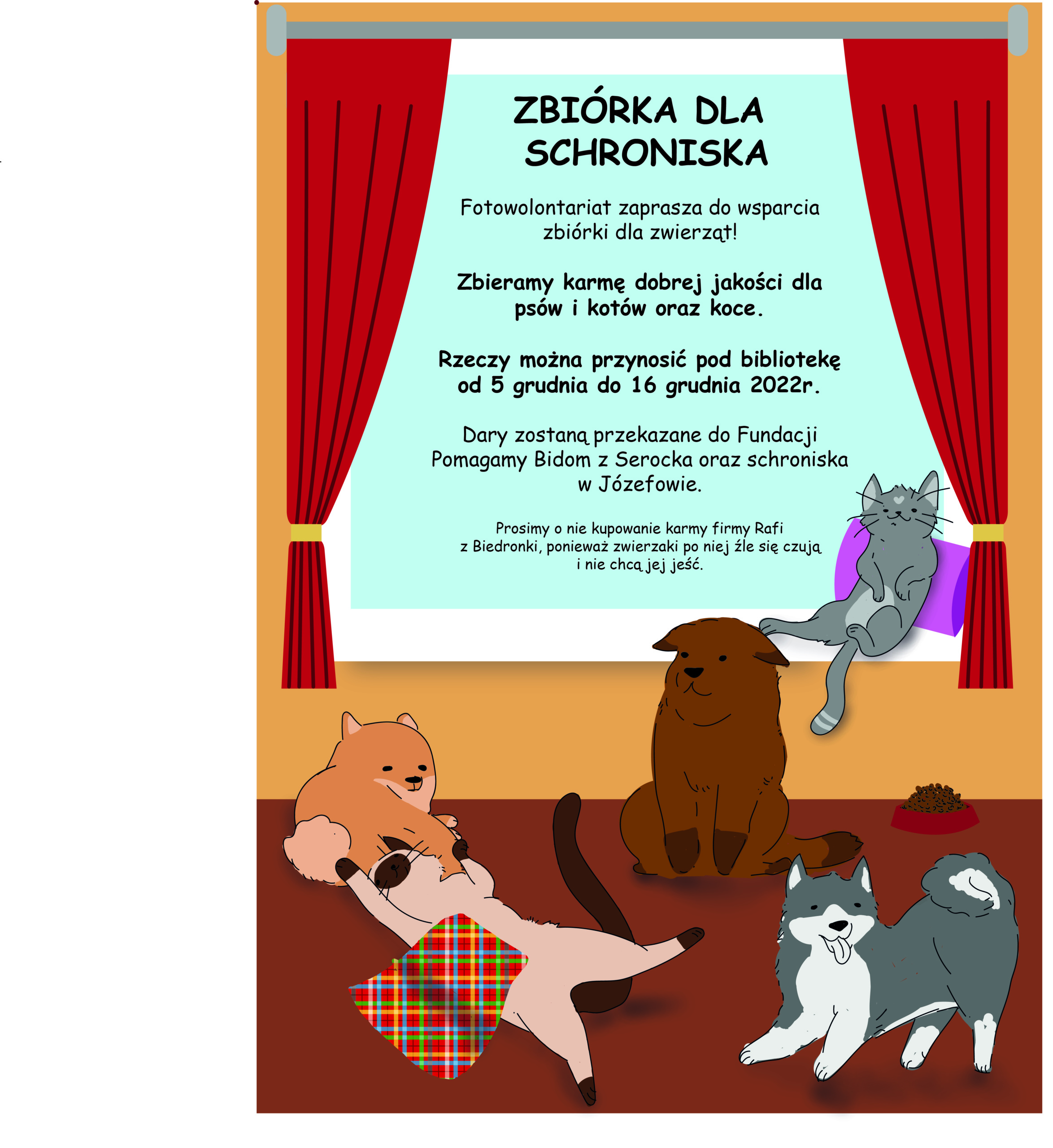 Rzeczy można przynosić pod bibliotekę od 5  do 16 grudnia 2022r. Dary zostaną przekazane do Fundacji Pomagamy Bidom z Serocka oraz schroniska w Józefowie.