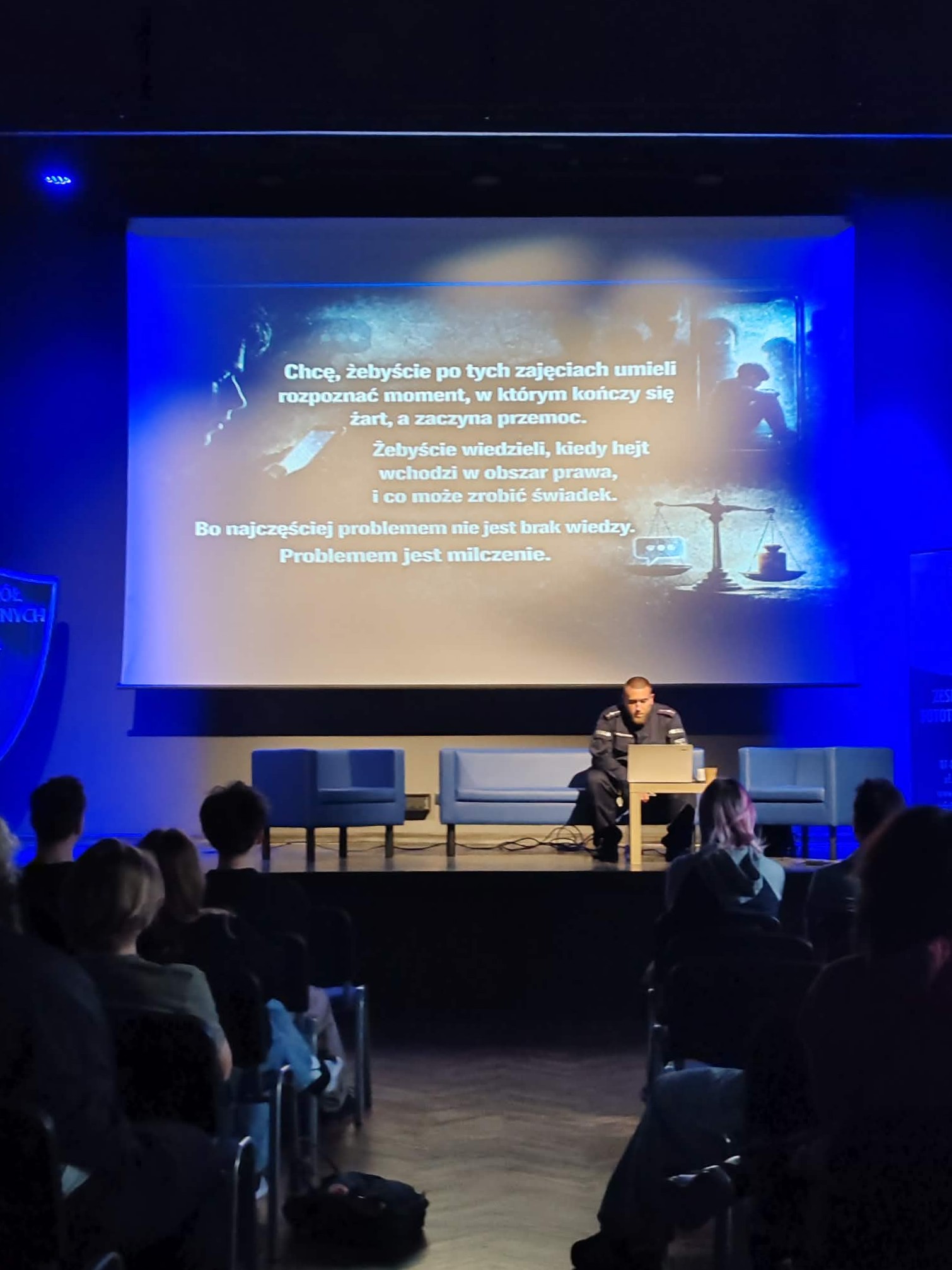 Podczas wydarzenia omówiono zjawisko hejtu oraz cyberprzemocy, przedstawiono odpowiedzialność prawną nieletnich, a także przeanalizowano realne konsekwencje społeczne i psychologiczne tych zachowań. Uczniowie poznali również mechanizmy reagowania na przemoc słowną i internetową oraz dostępne formy wsparcia.