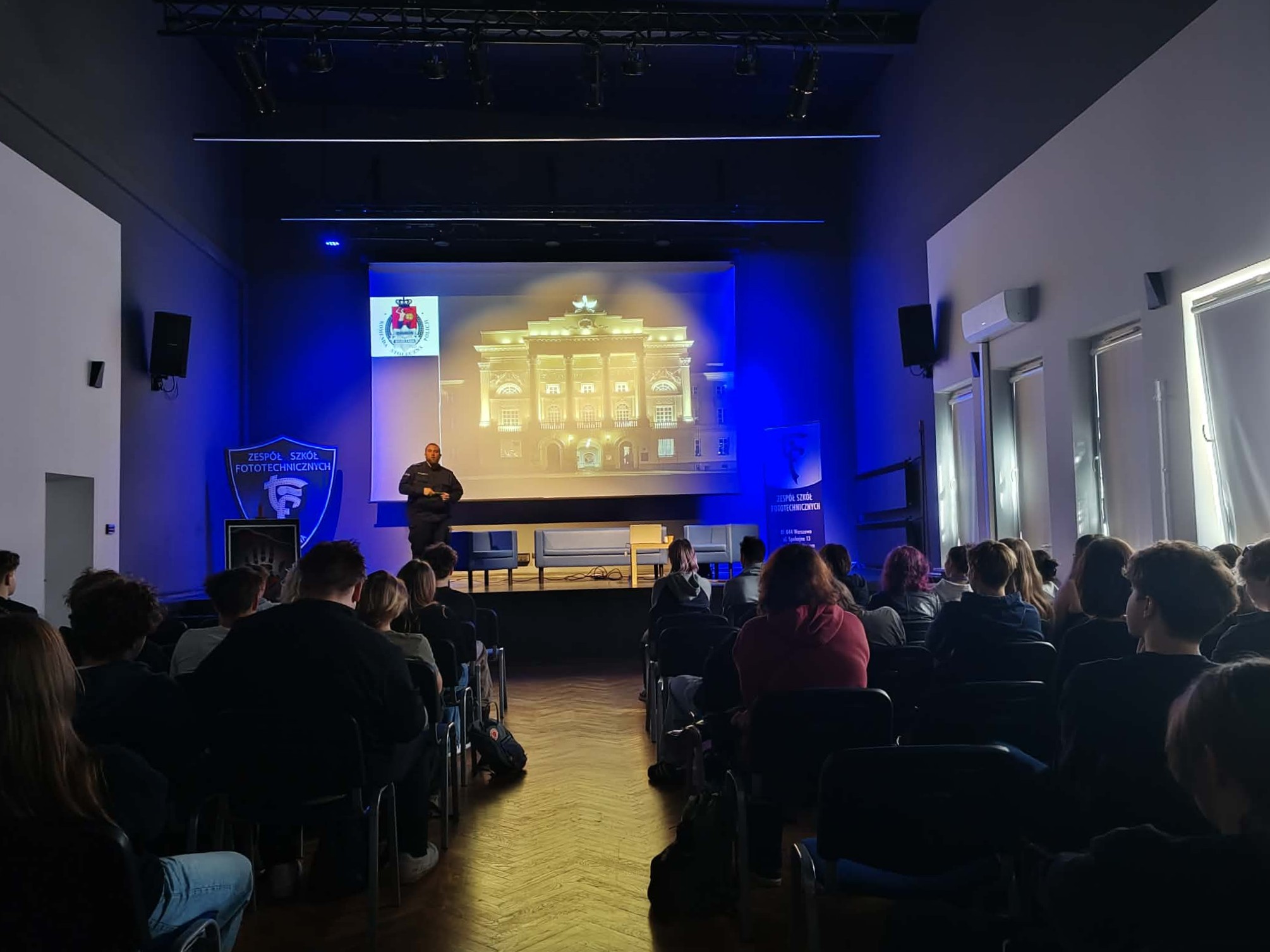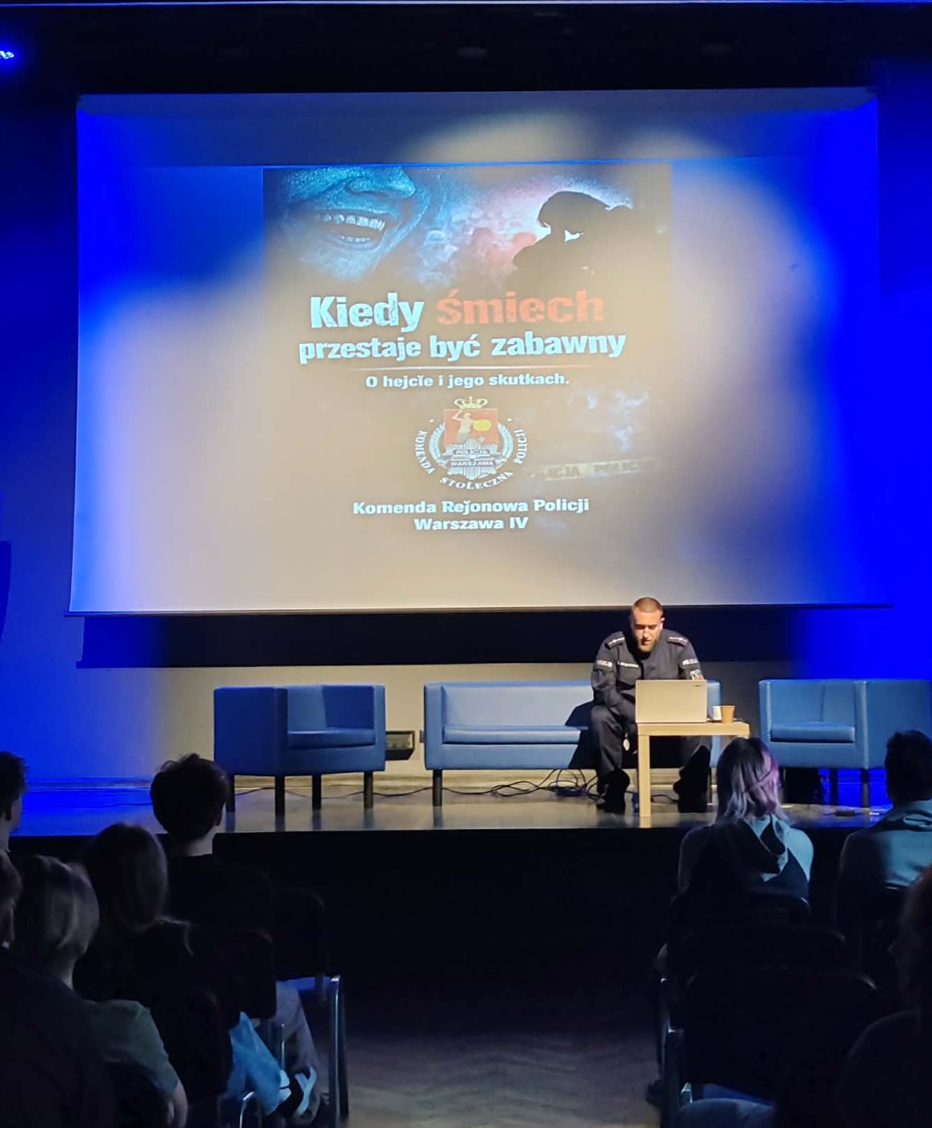 W dniu 20 kwietnia 2026 r. młodzież z naszej szkoły wzięła udział w spotkaniu związanym z realizacją programu profilaktycznego pt. „Kiedy śmiech przestaje być zabawny – o hejcie i jego skutkach”.n Uczestniczyli w nim uczniowie z klas 2ta, 3ta, 4ta, 3tf, 3can, 3bf, 4tb, 2tb, 2tf oraz 3tb. Spotkania poprowadził funkcjonariusz Wydziału Profilaktyki Społecznej, Nieletnich i Patologii Komendy Stołecznej Policji Warszawa IV.