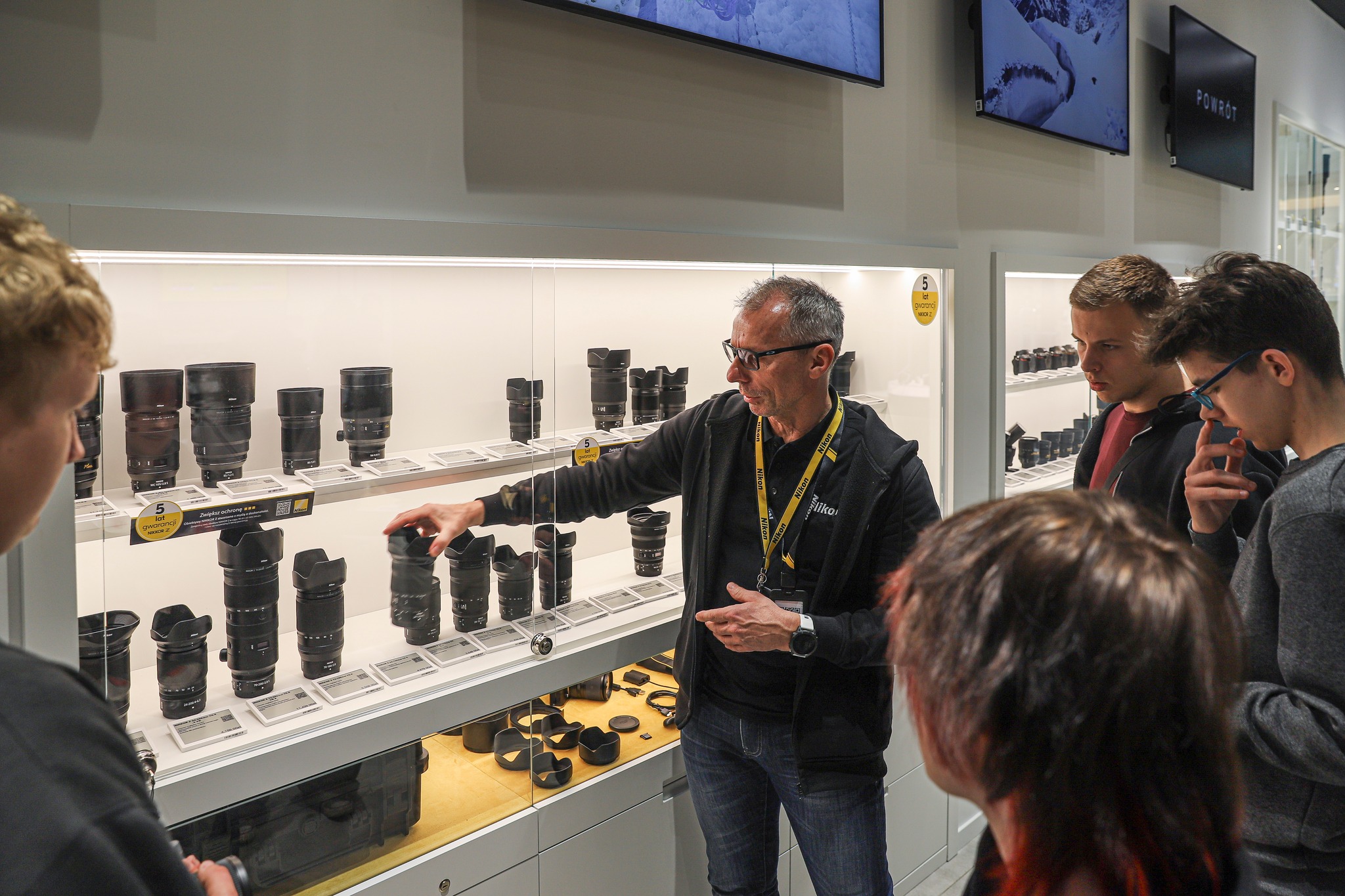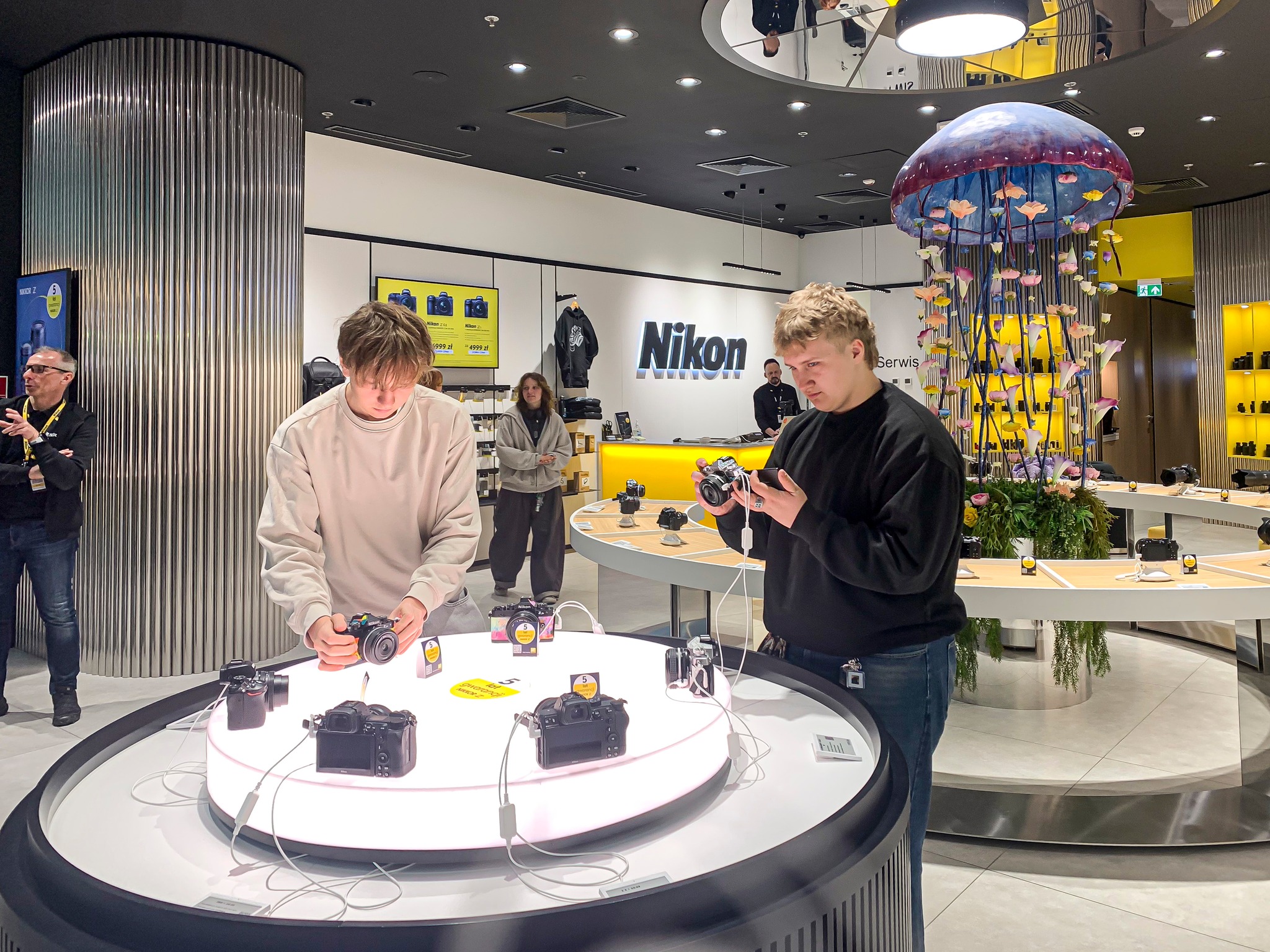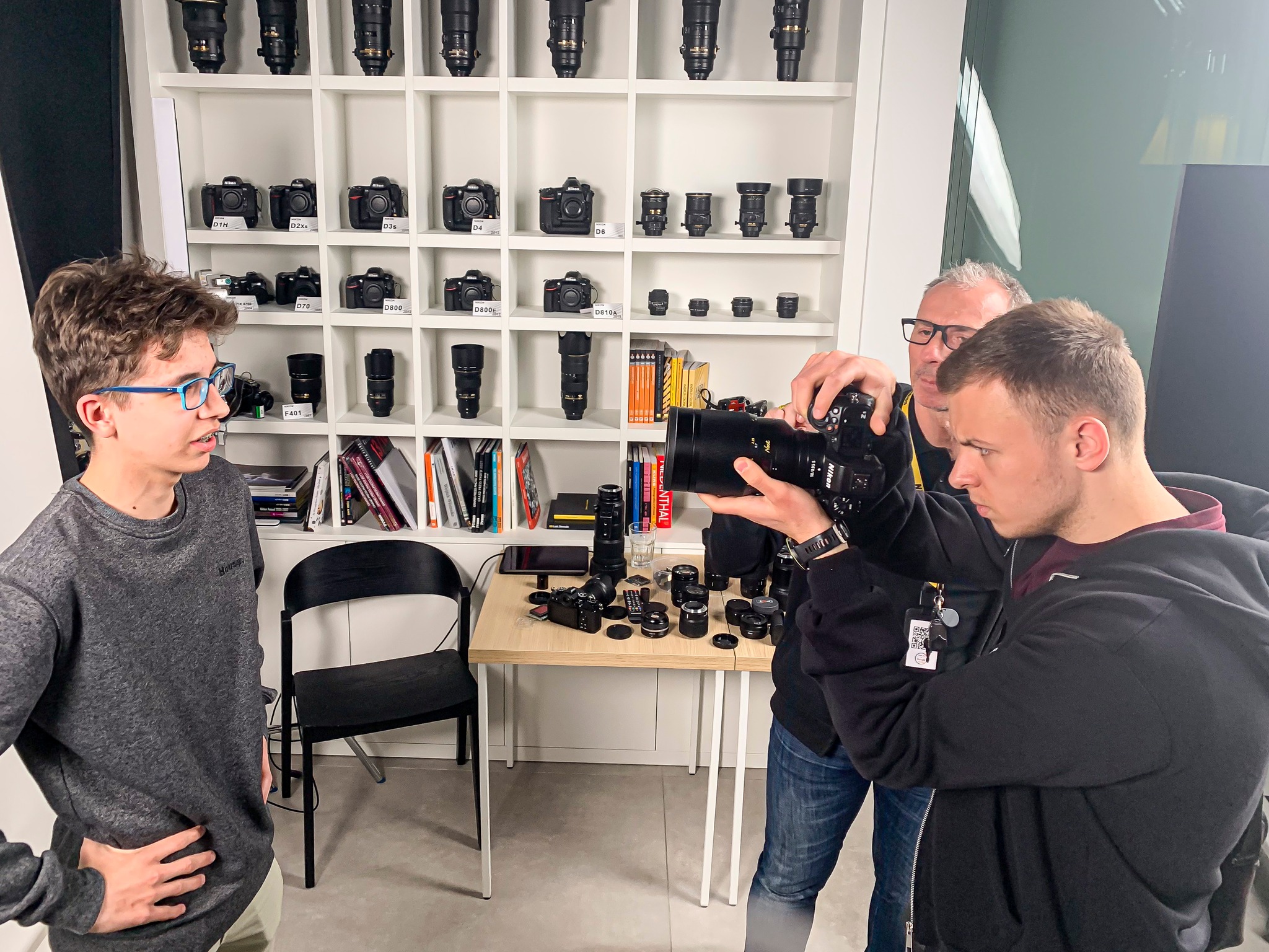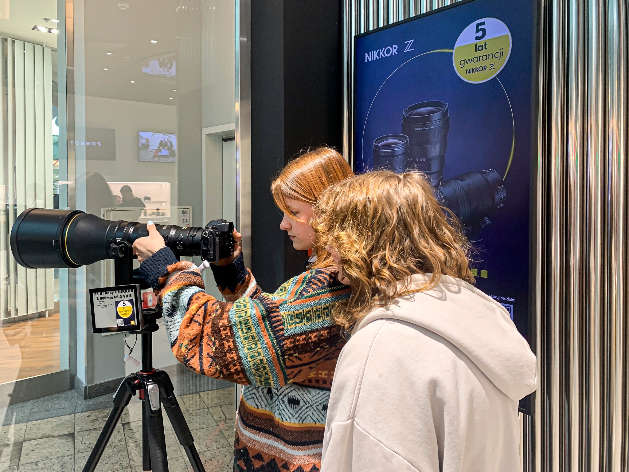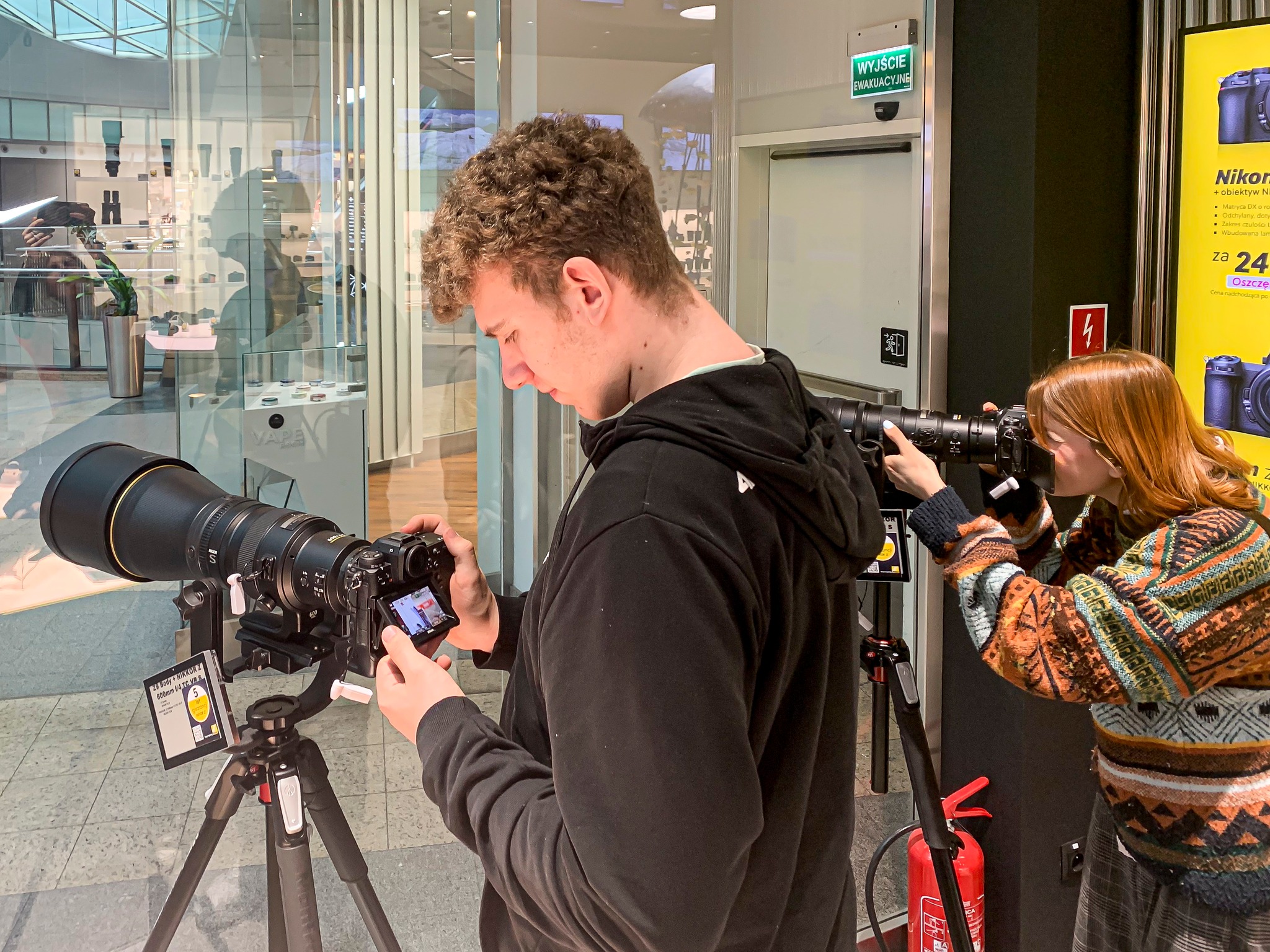 Istotnym elementem zajęć była możliwość praktycznego testowania sprzętu fotograficznego udostępnionego przez firmę Nikon. Uczniowie mogli pracować zarówno w sali szkoleniowej Nikon School, jak i w salonie, w strefie Touch & Try, gdzie sprawdzali różne modele aparatów oraz porównywali sprzęt pełno- i niepełnoklatkowy, m.in. Nikon Z50 oraz Nikon Z8. Szczególne zainteresowanie wzbudził najdłuższy istniejący obiektyw do aparatów Nikona, wykorzystywany w fotografii sportowej i przyrodniczej.