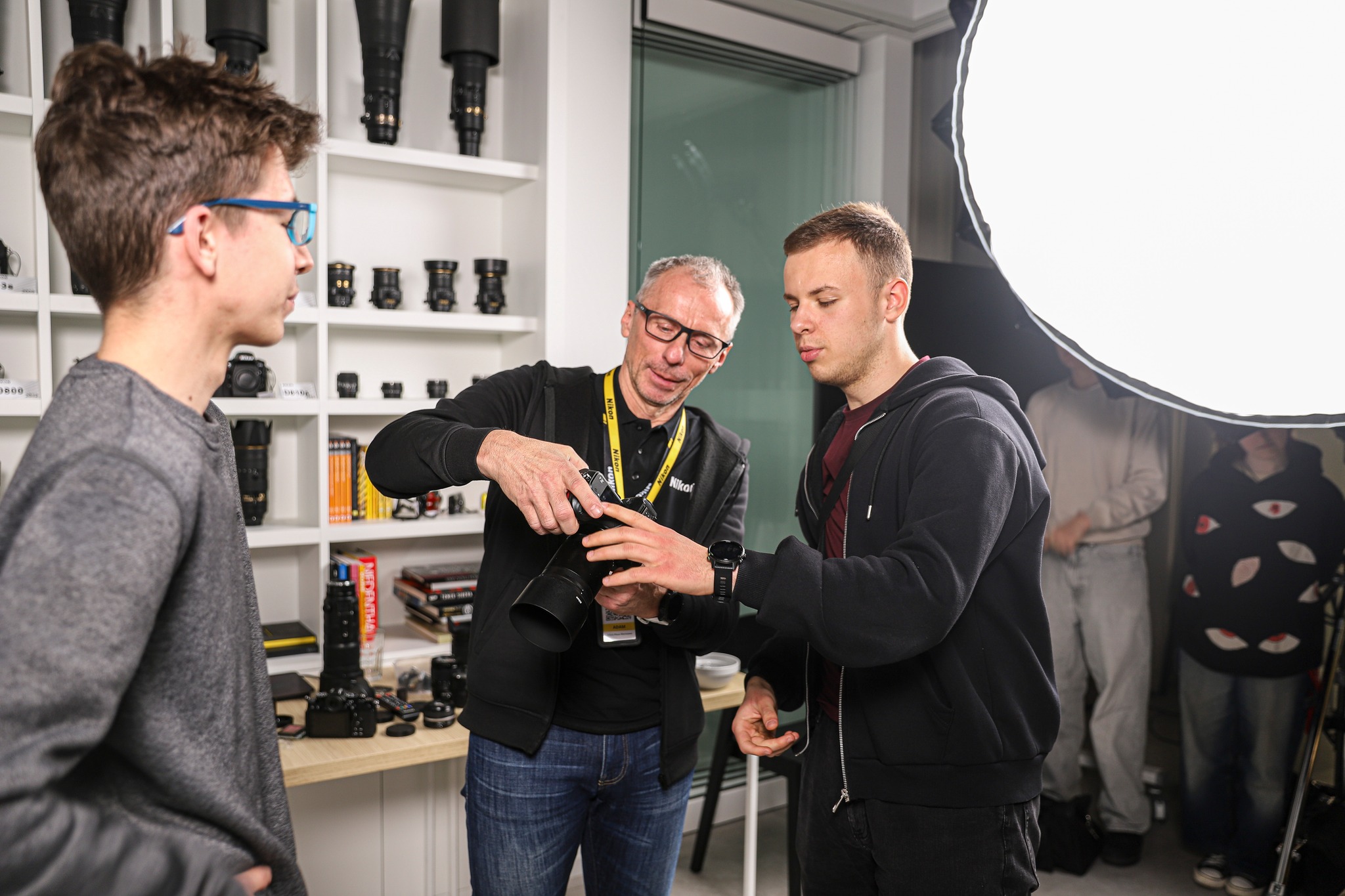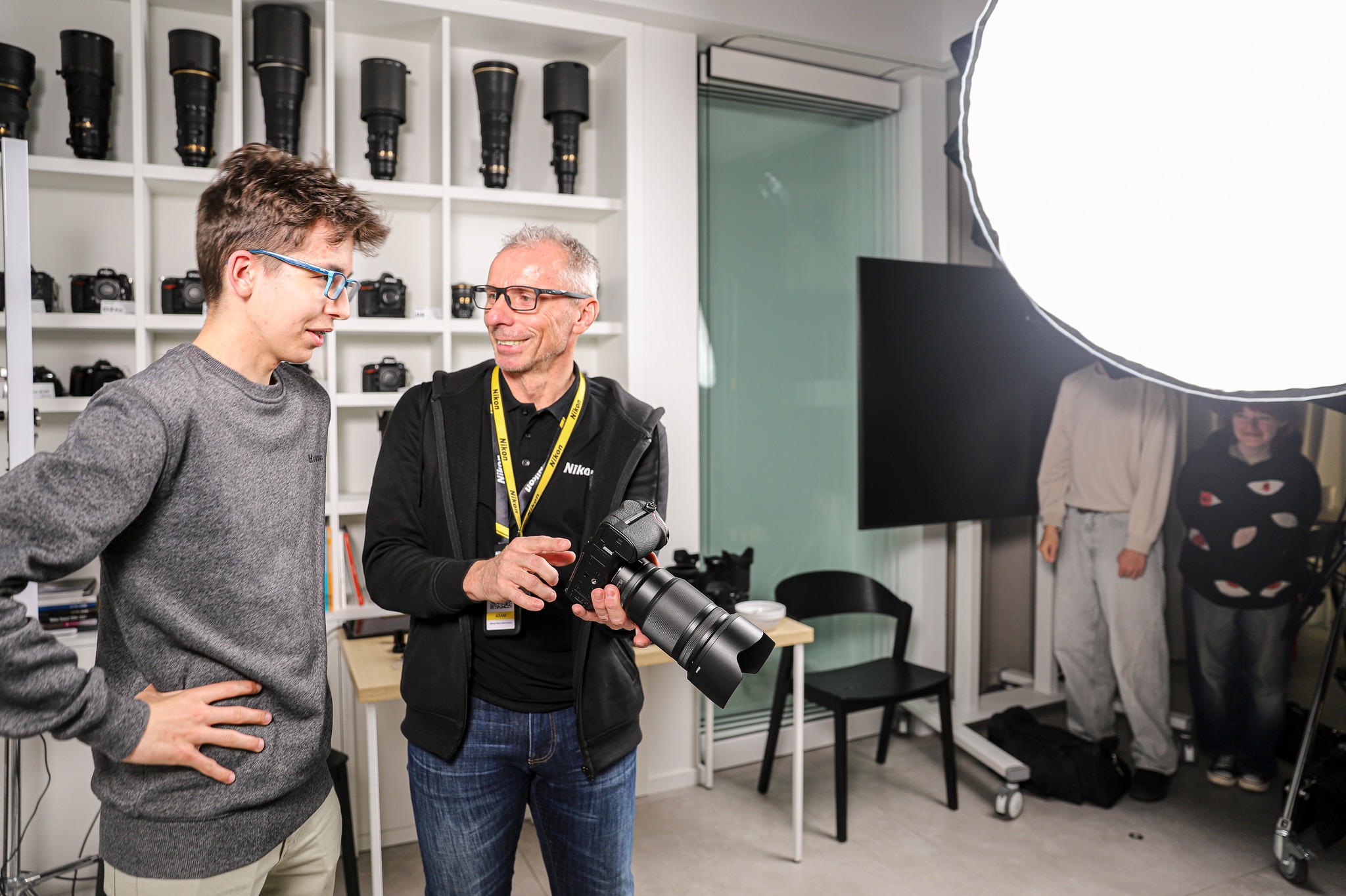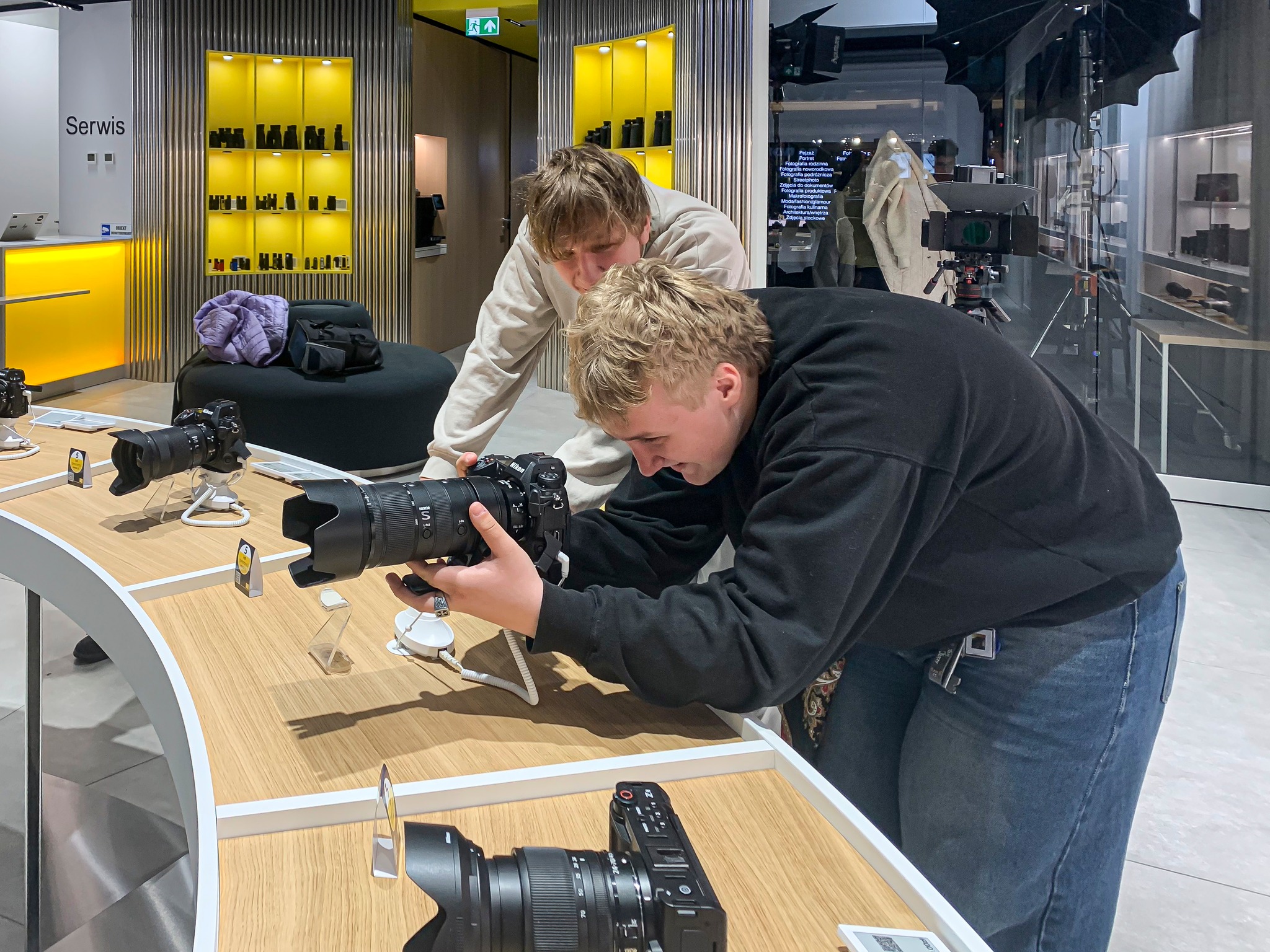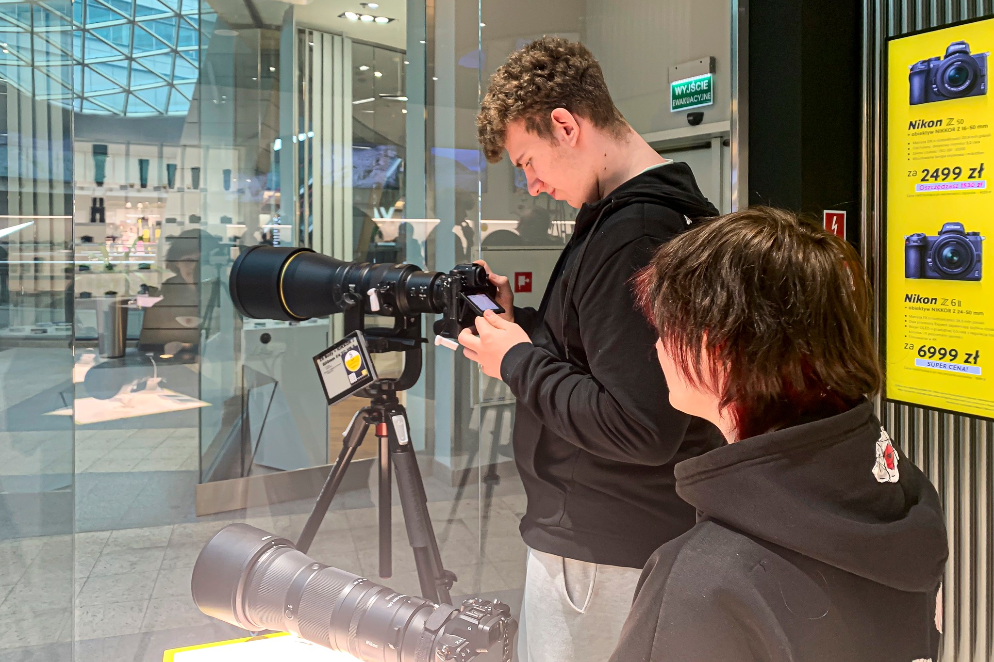 Istotnym elementem zajęć była możliwość praktycznego testowania sprzętu fotograficznego udostępnionego przez firmę Nikon. Uczniowie mogli pracować zarówno w sali szkoleniowej Nikon School, jak i w salonie, w strefie Touch & Try, gdzie sprawdzali różne modele aparatów oraz porównywali sprzęt pełno- i niepełnoklatkowy, m.in. Nikon Z50 oraz Nikon Z8. Szczególne zainteresowanie wzbudził najdłuższy istniejący obiektyw do aparatów Nikona, wykorzystywany w fotografii sportowej i przyrodniczej.