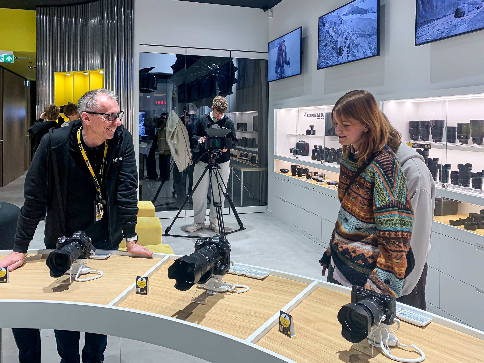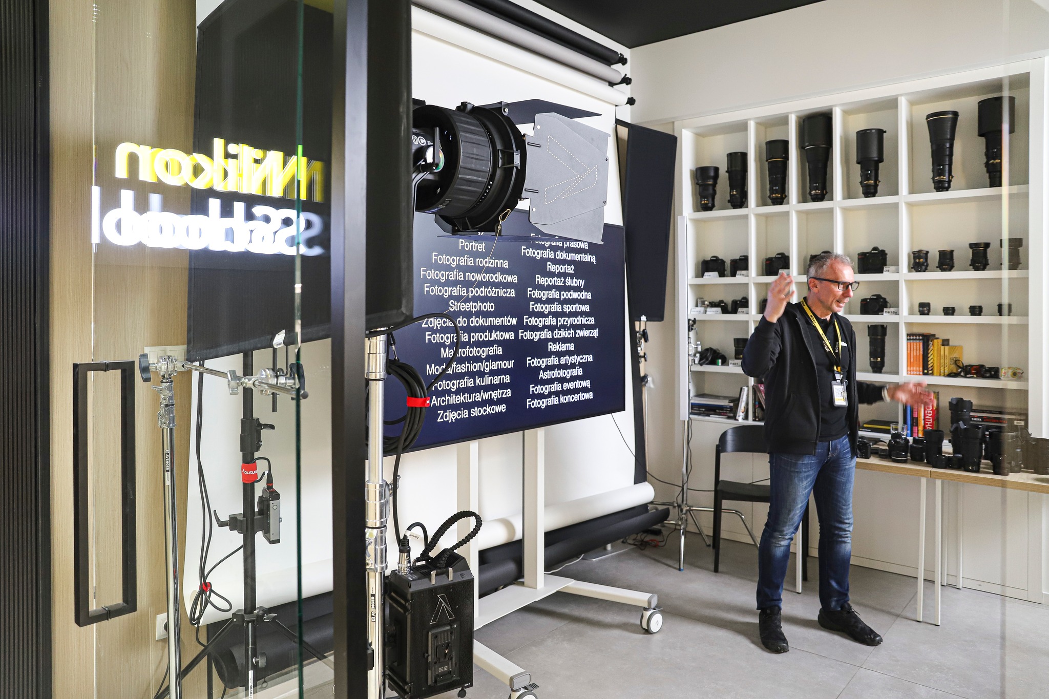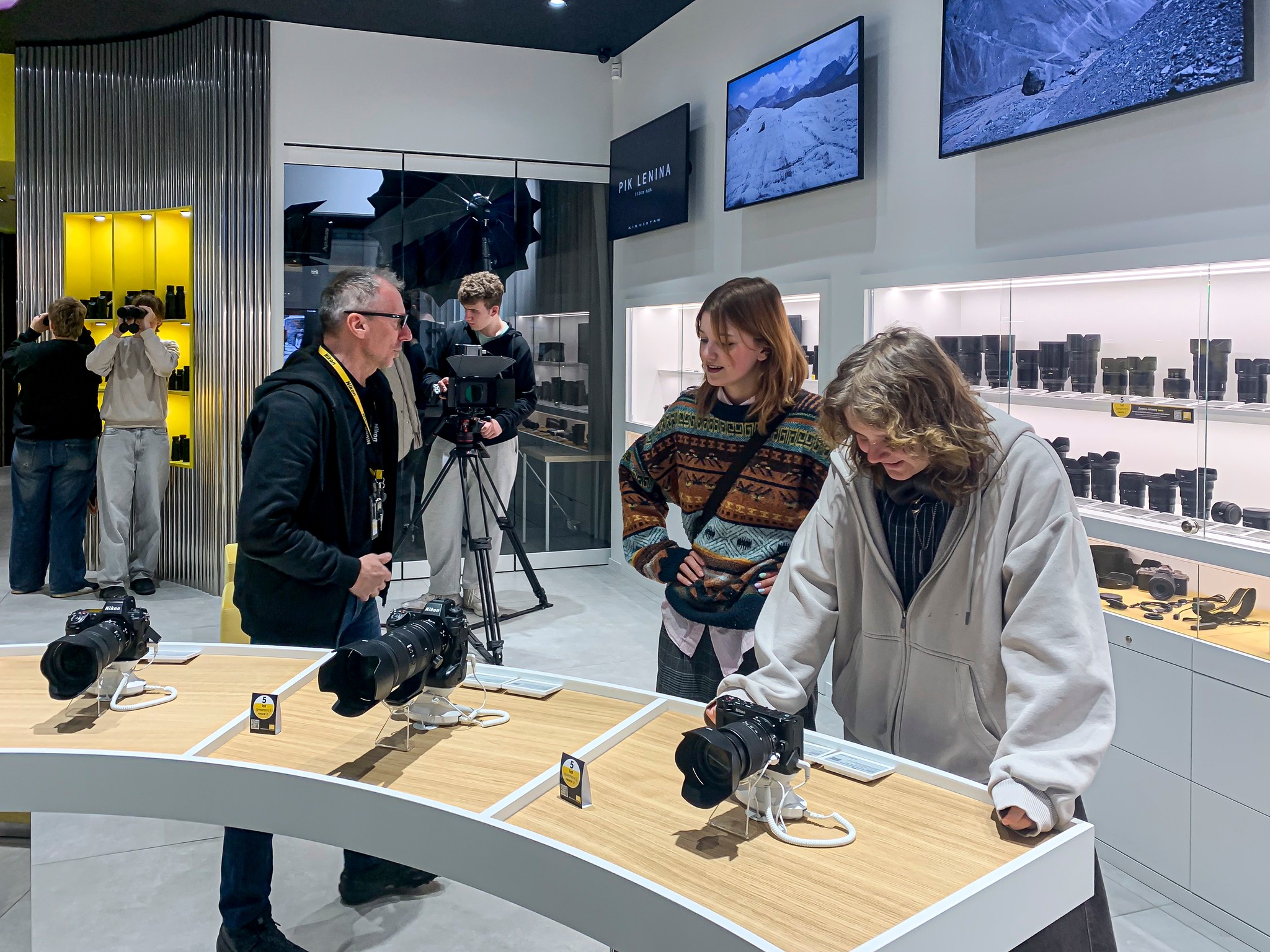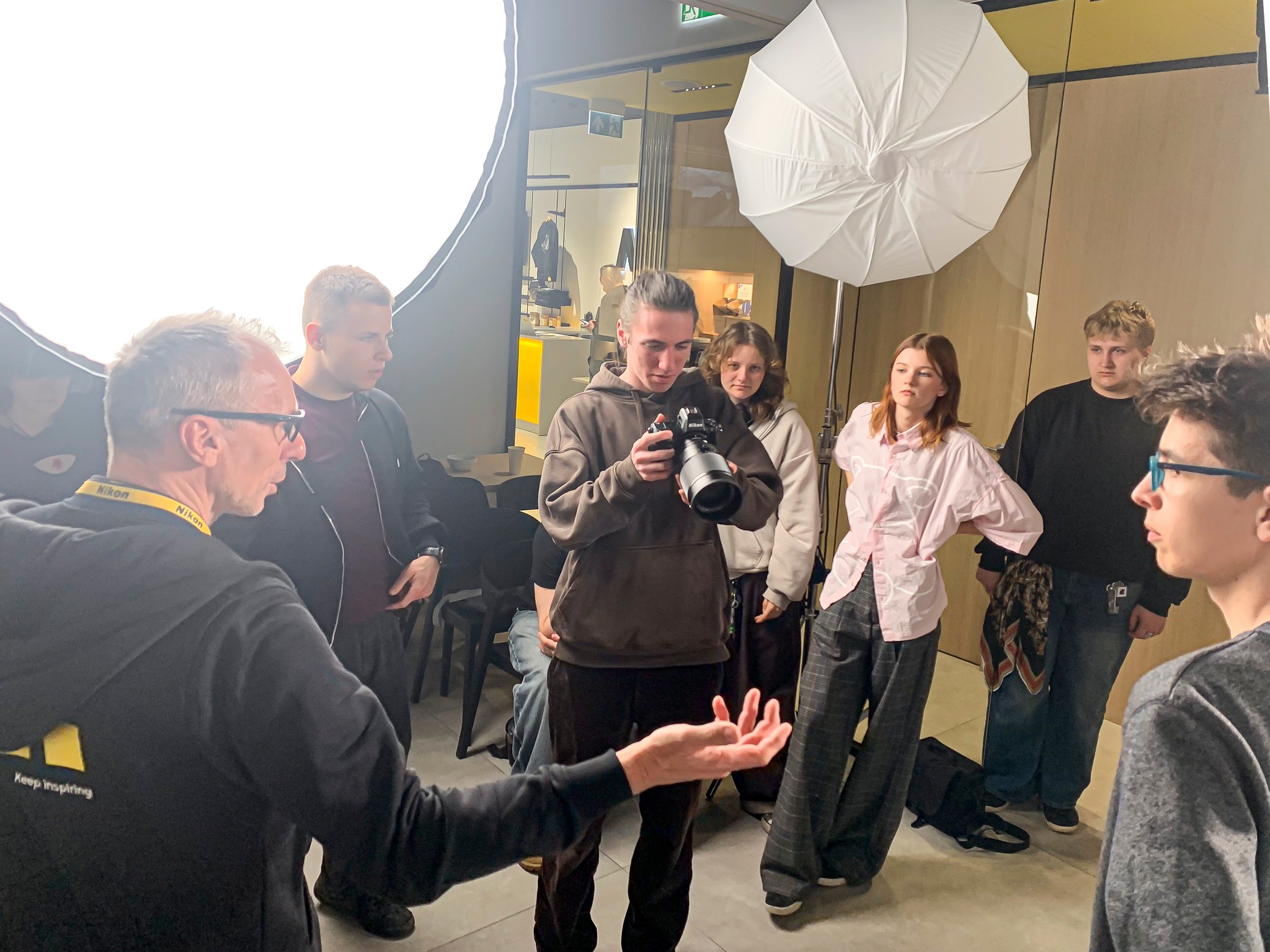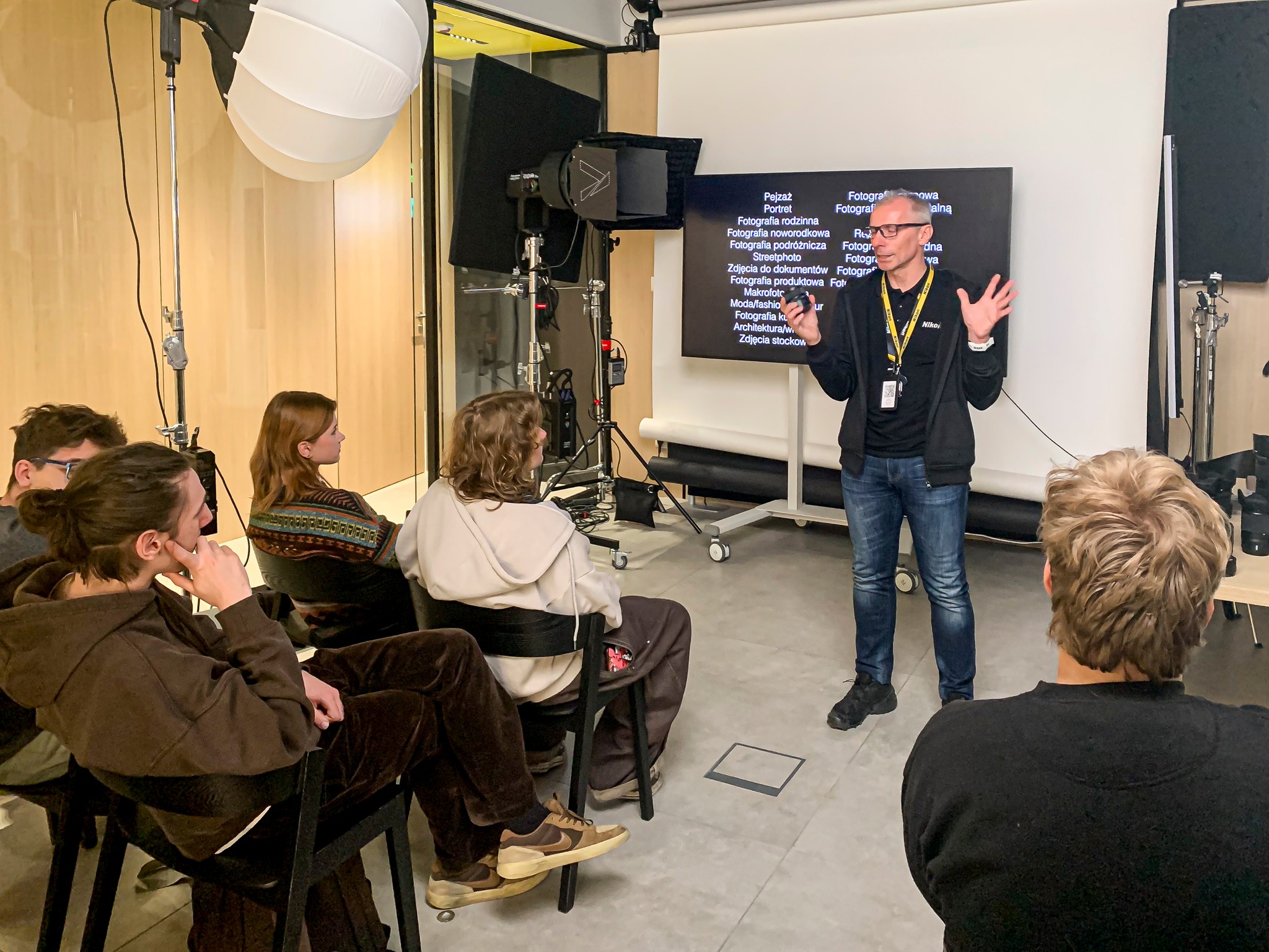 Istotnym elementem zajęć była możliwość praktycznego testowania sprzętu fotograficznego udostępnionego przez firmę Nikon. Uczniowie mogli pracować zarówno w sali szkoleniowej Nikon School, jak i w salonie, w strefie Touch & Try, gdzie sprawdzali różne modele aparatów oraz porównywali sprzęt pełno- i niepełnoklatkowy, m.in. Nikon Z50 oraz Nikon Z8. Szczególne zainteresowanie wzbudził najdłuższy istniejący obiektyw do aparatów Nikona, wykorzystywany w fotografii sportowej i przyrodniczej.