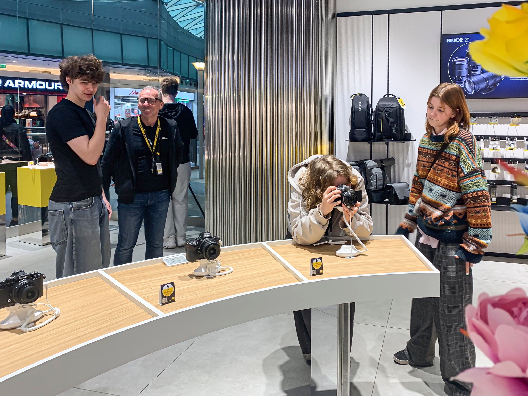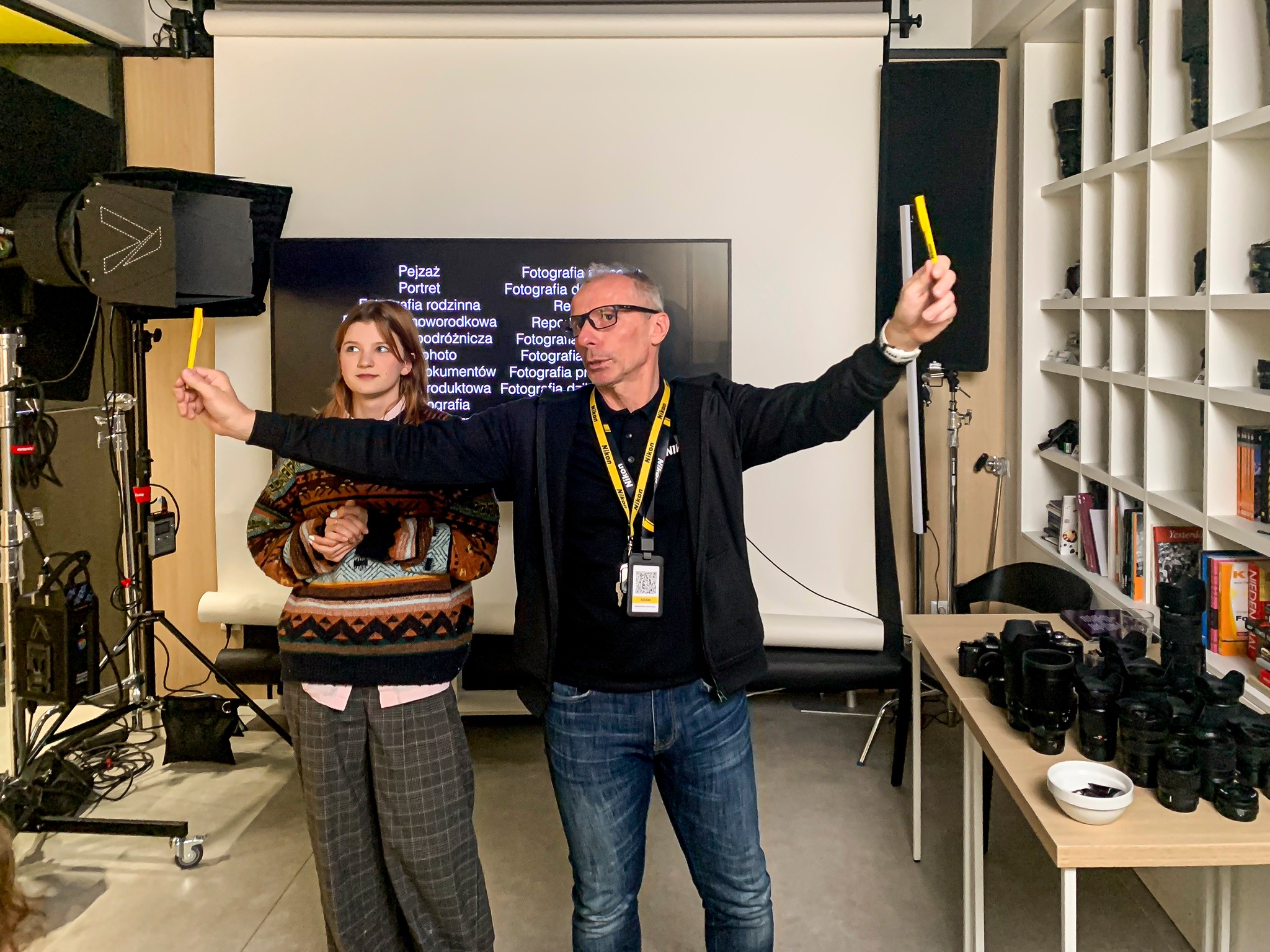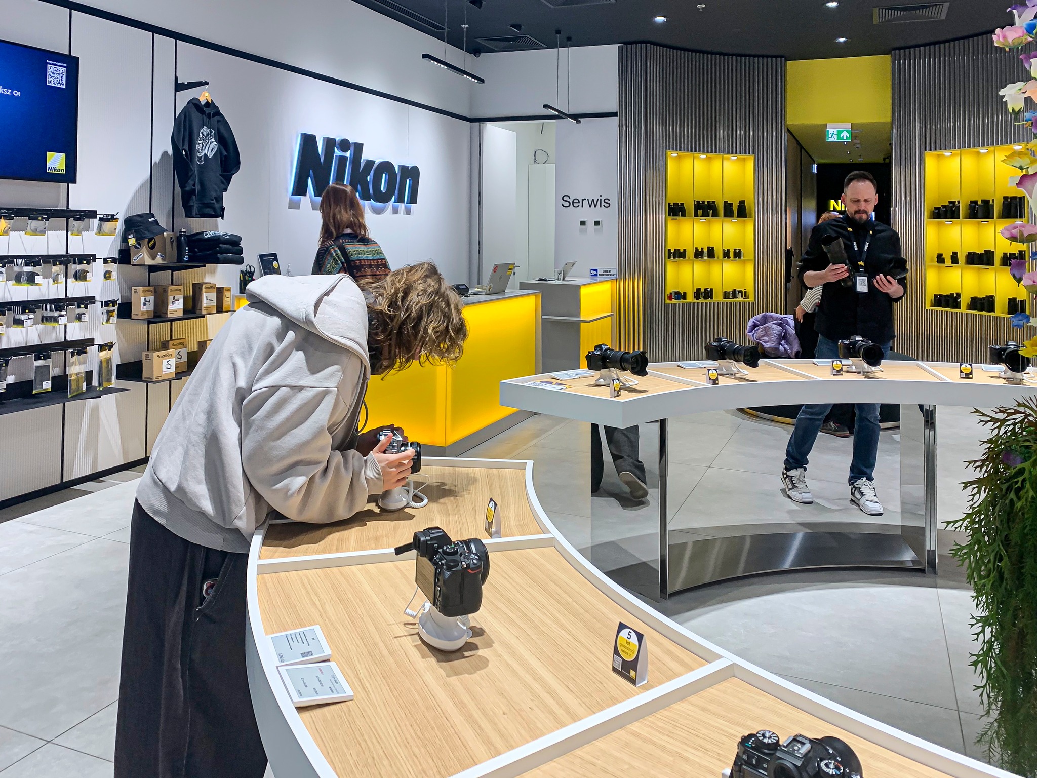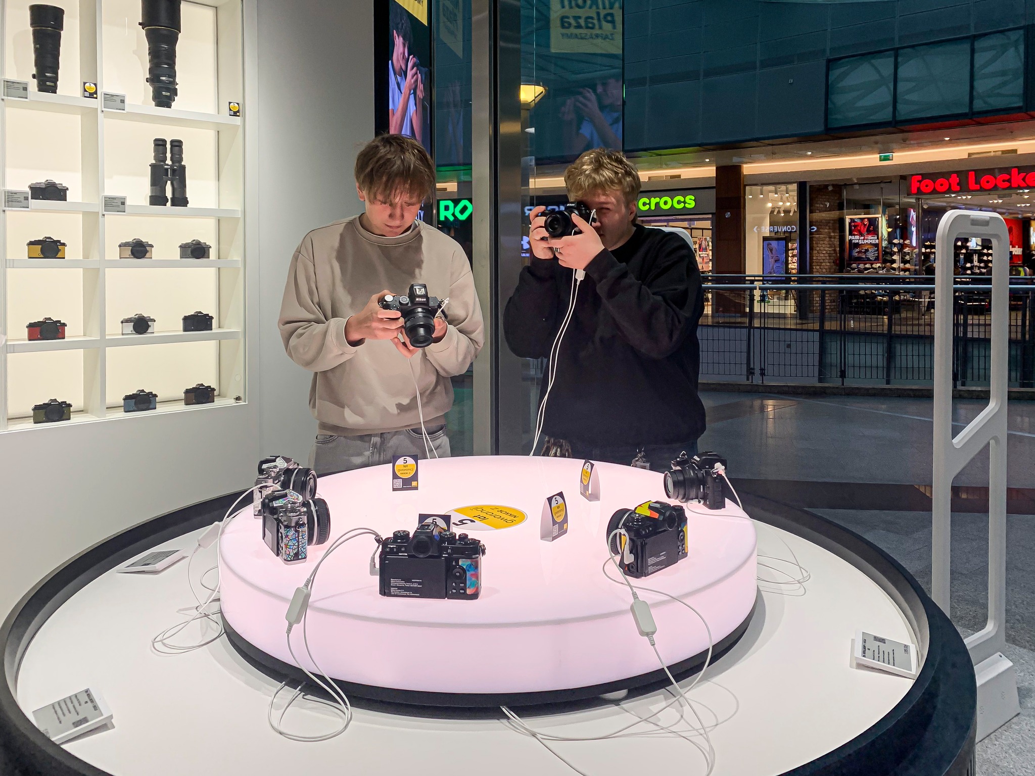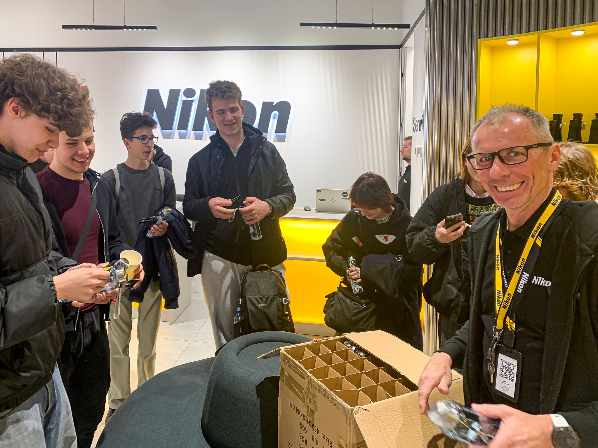 Istotnym elementem zajęć była możliwość praktycznego testowania sprzętu fotograficznego udostępnionego przez firmę Nikon. Uczniowie mogli pracować zarówno w sali szkoleniowej Nikon School, jak i w salonie, w strefie Touch & Try, gdzie sprawdzali różne modele aparatów oraz porównywali sprzęt pełno- i niepełnoklatkowy, m.in. Nikon Z50 oraz Nikon Z8. Szczególne zainteresowanie wzbudził najdłuższy istniejący obiektyw do aparatów Nikona, wykorzystywany w fotografii sportowej i przyrodniczej.