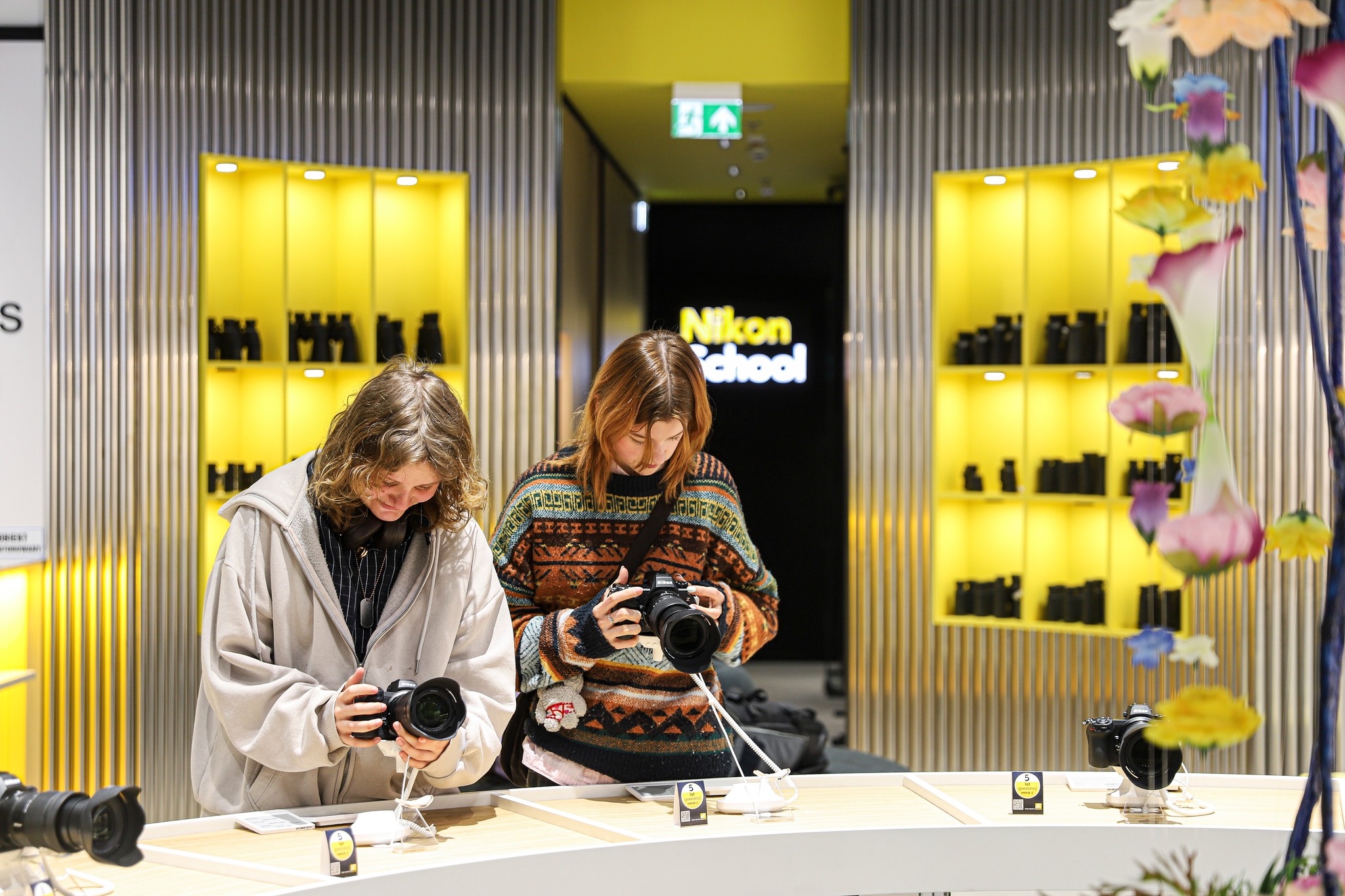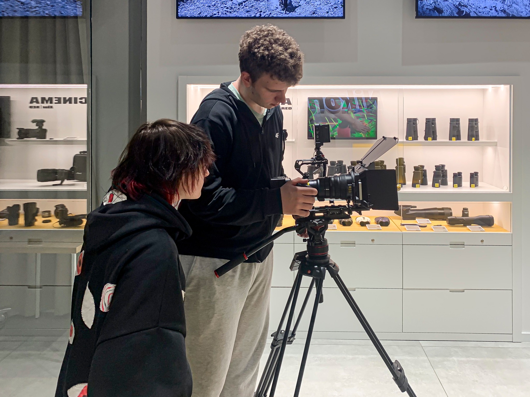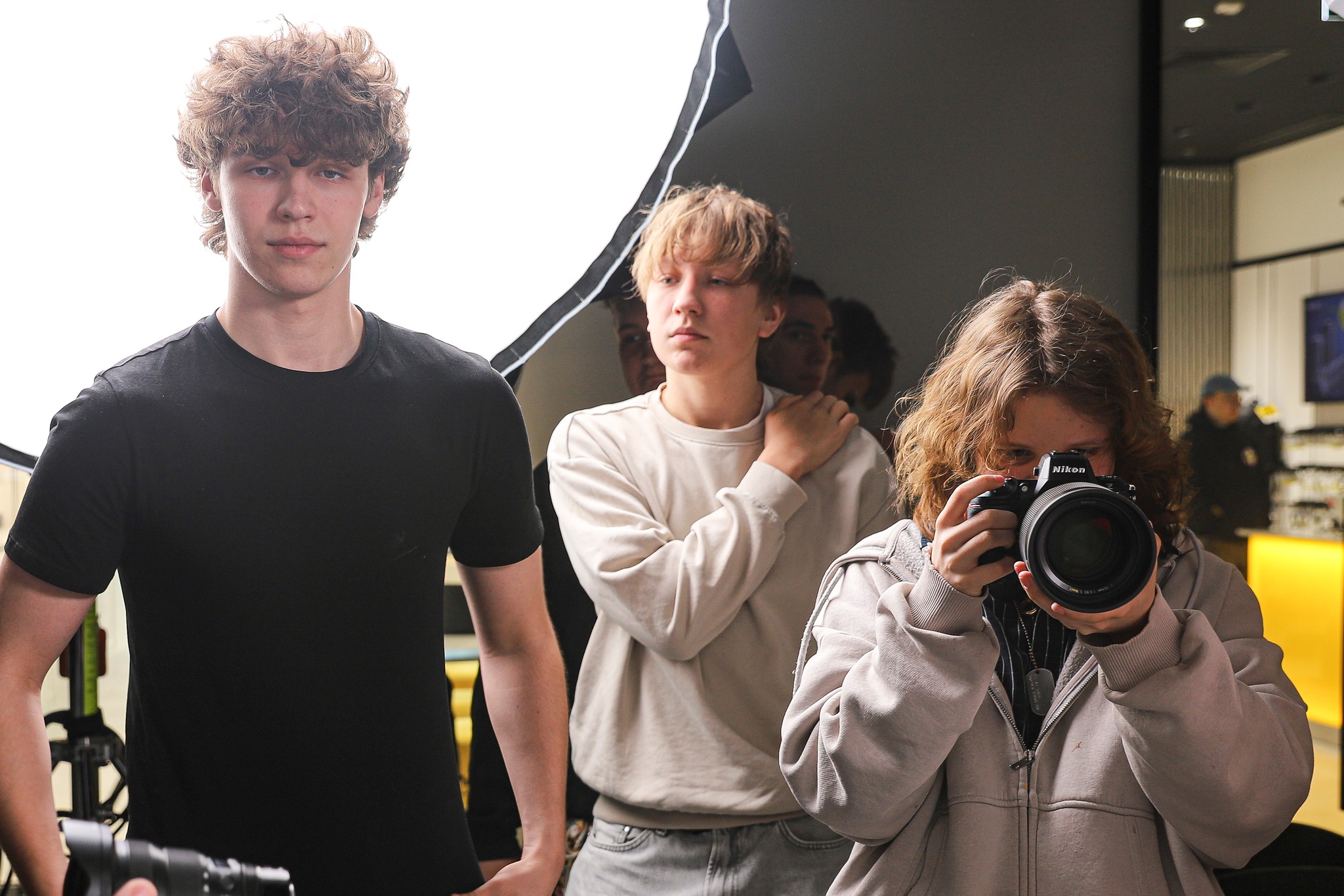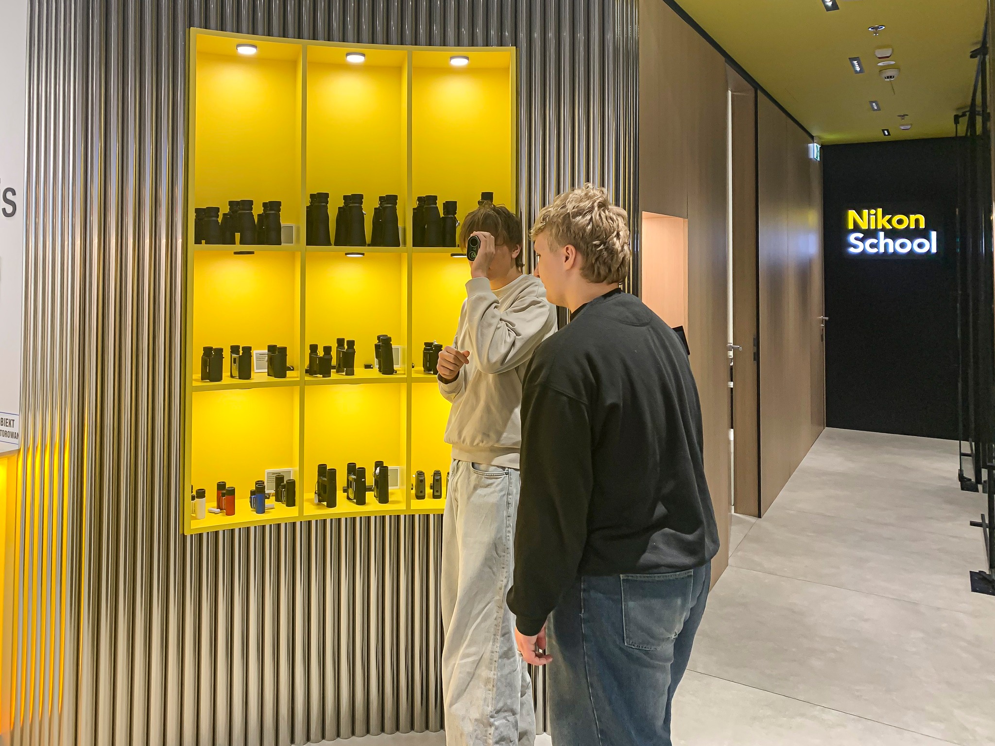 Istotnym elementem zajęć była możliwość praktycznego testowania sprzętu fotograficznego udostępnionego przez firmę Nikon. Uczniowie mogli pracować zarówno w sali szkoleniowej Nikon School, jak i w salonie, w strefie Touch & Try, gdzie sprawdzali różne modele aparatów oraz porównywali sprzęt pełno- i niepełnoklatkowy, m.in. Nikon Z50 oraz Nikon Z8. Szczególne zainteresowanie wzbudził najdłuższy istniejący obiektyw do aparatów Nikona, wykorzystywany w fotografii sportowej i przyrodniczej.