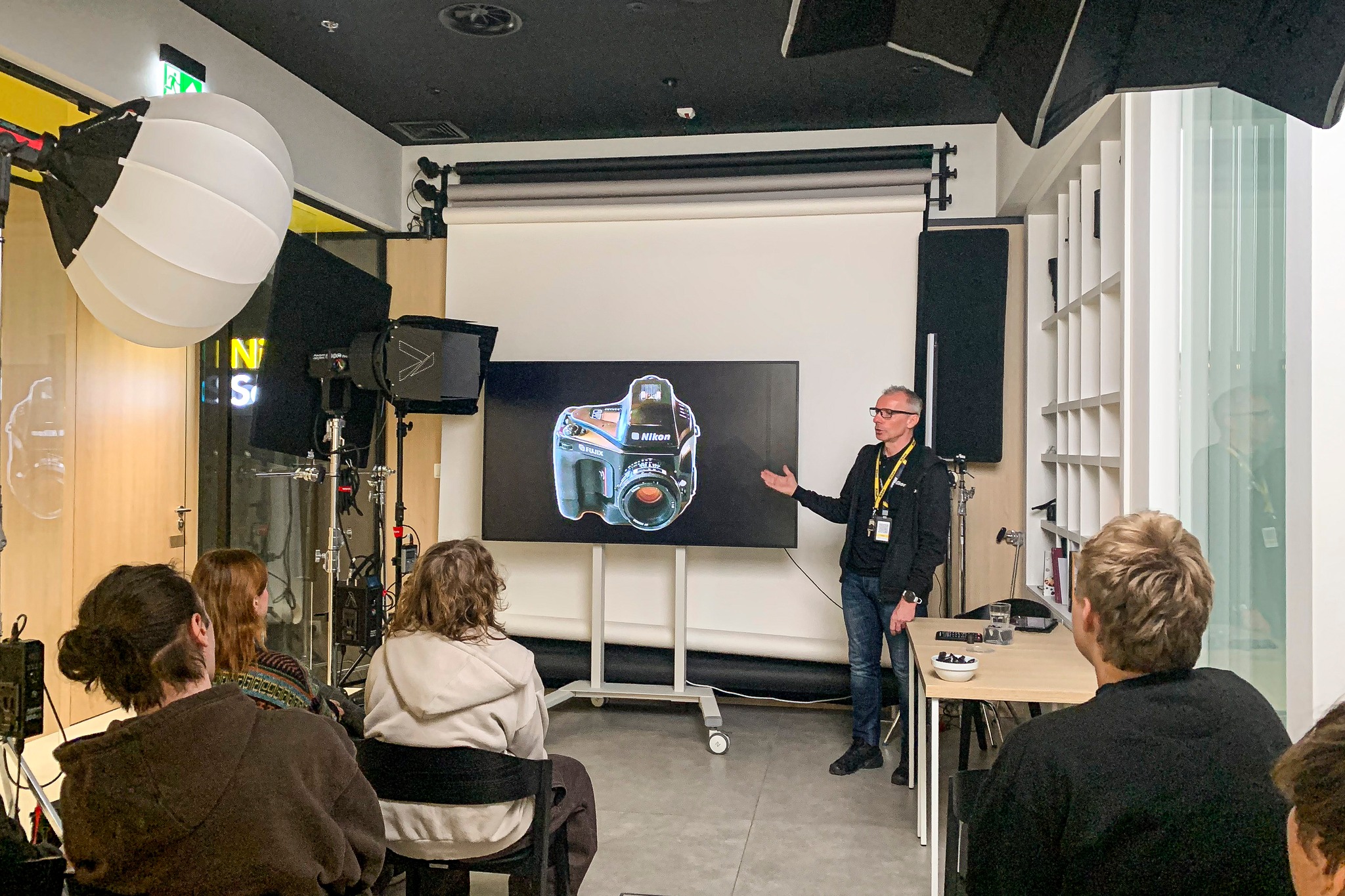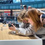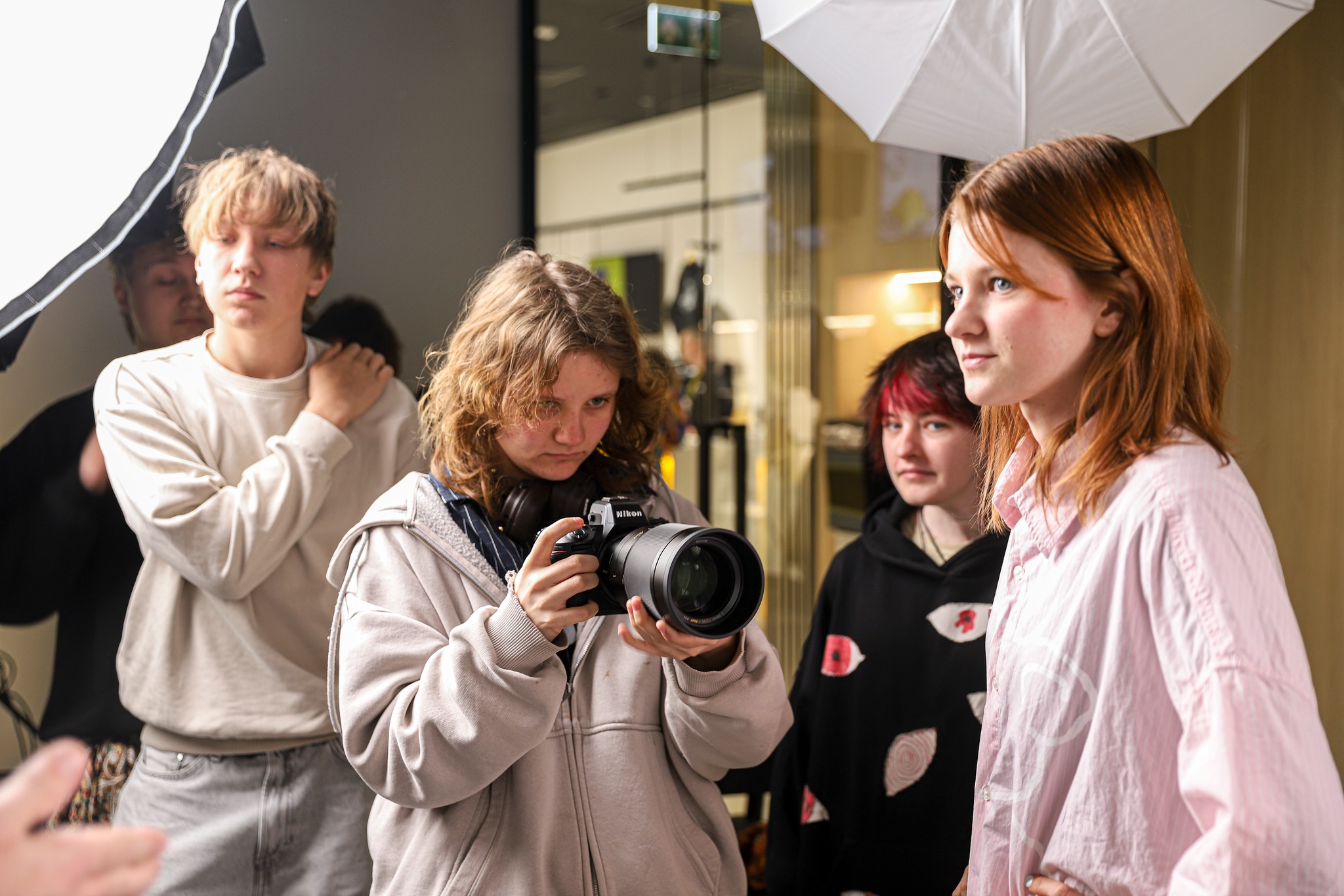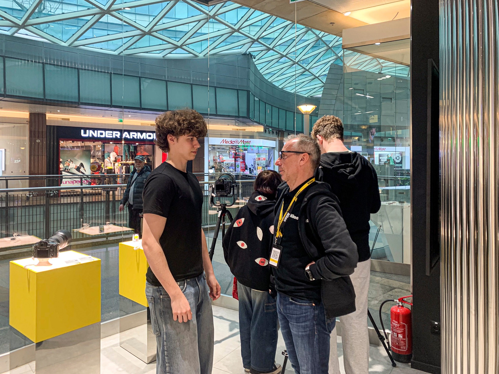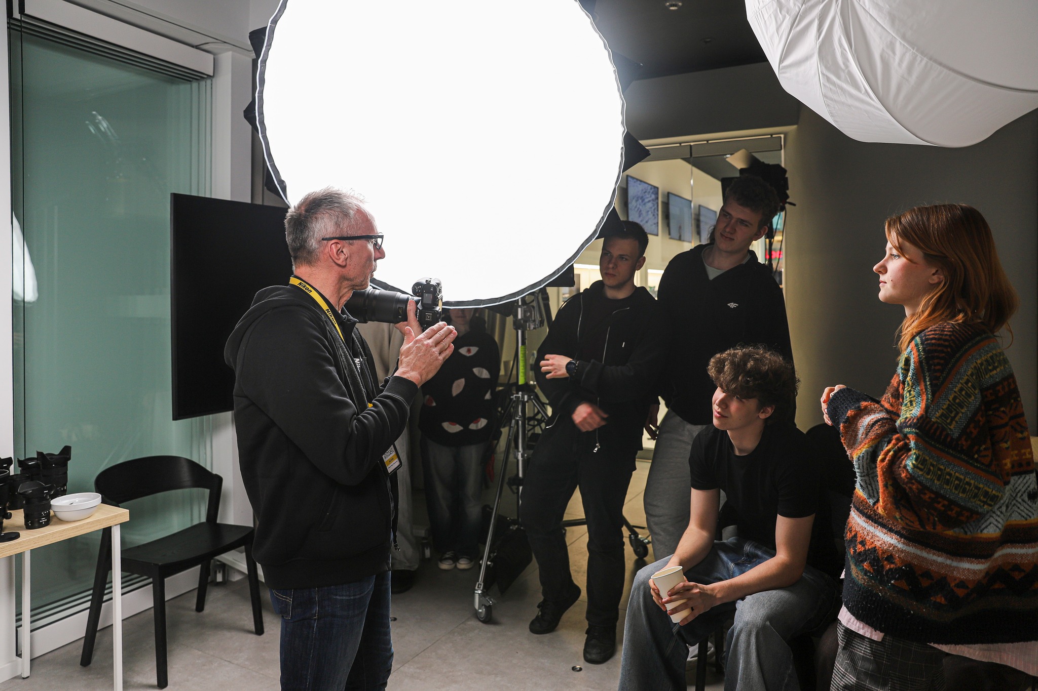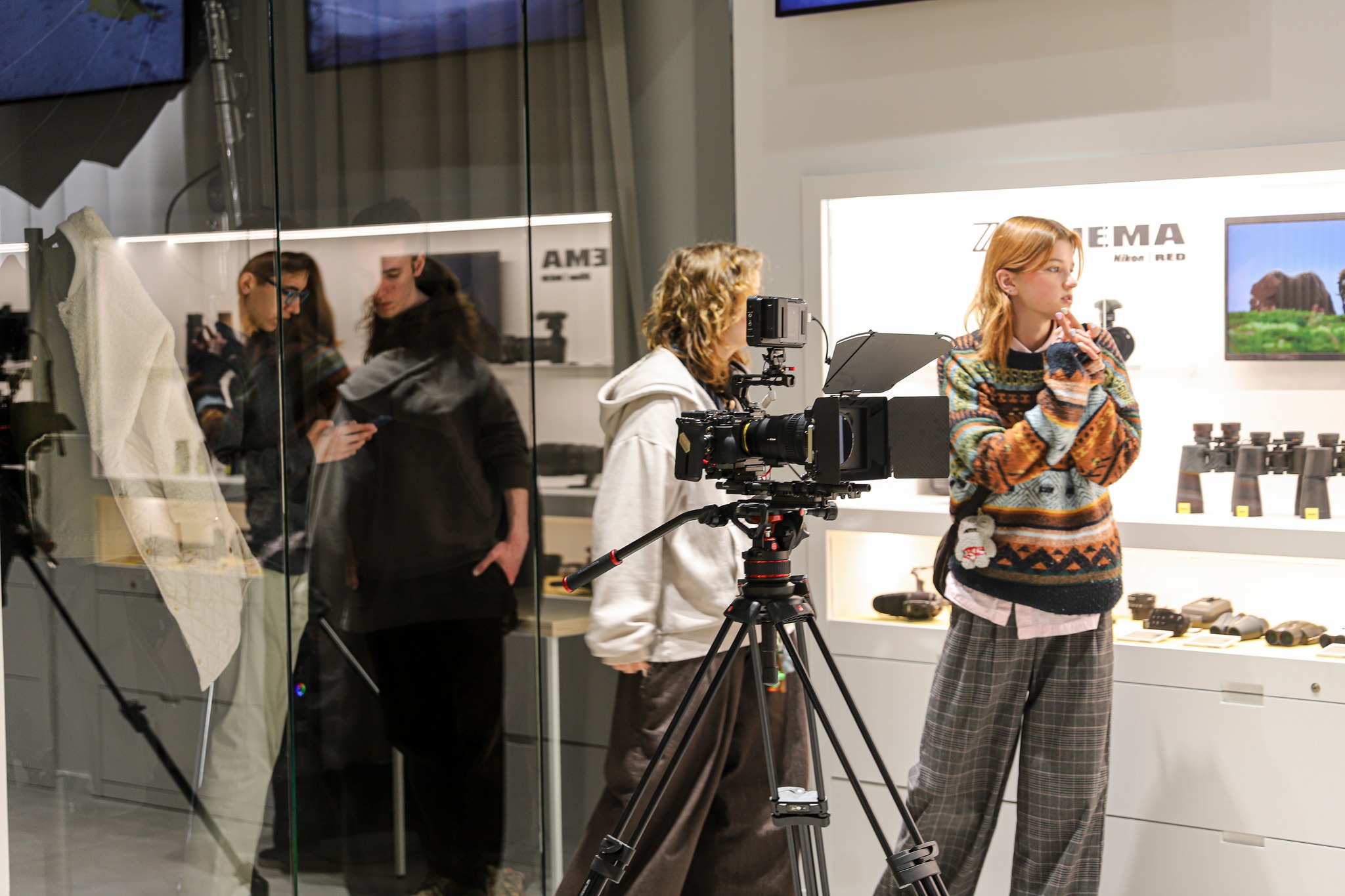 Istotnym elementem zajęć była możliwość praktycznego testowania sprzętu fotograficznego udostępnionego przez firmę Nikon. Uczniowie mogli pracować zarówno w sali szkoleniowej Nikon School, jak i w salonie, w strefie Touch & Try, gdzie sprawdzali różne modele aparatów oraz porównywali sprzęt pełno- i niepełnoklatkowy, m.in. Nikon Z50 oraz Nikon Z8. Szczególne zainteresowanie wzbudził najdłuższy istniejący obiektyw do aparatów Nikona, wykorzystywany w fotografii sportowej i przyrodniczej.