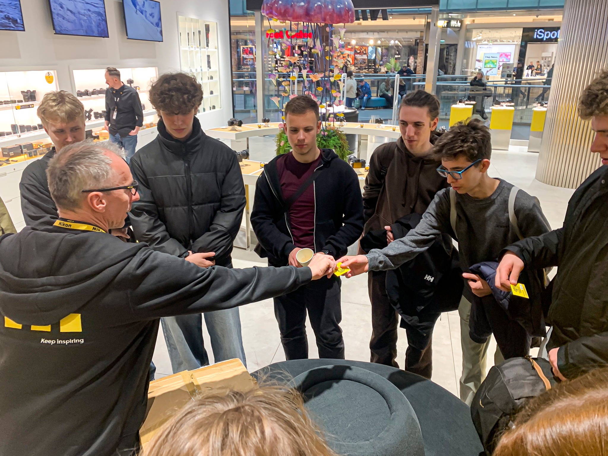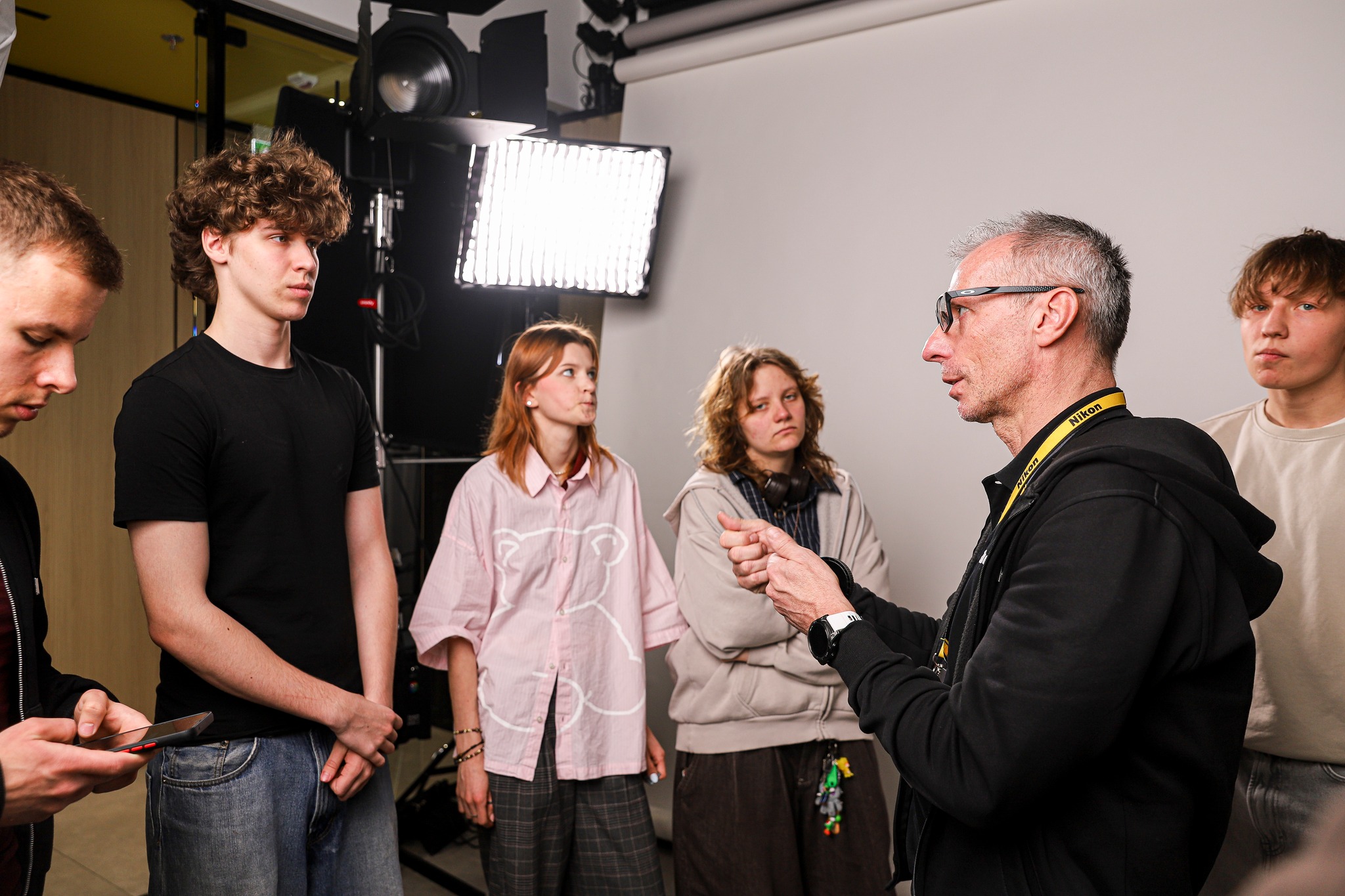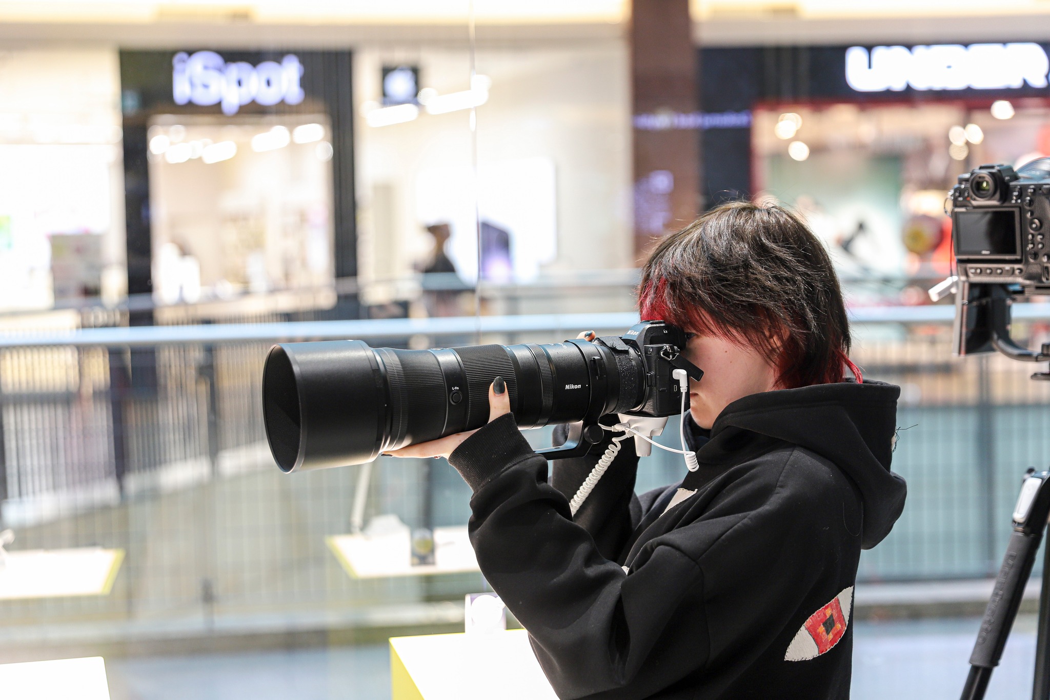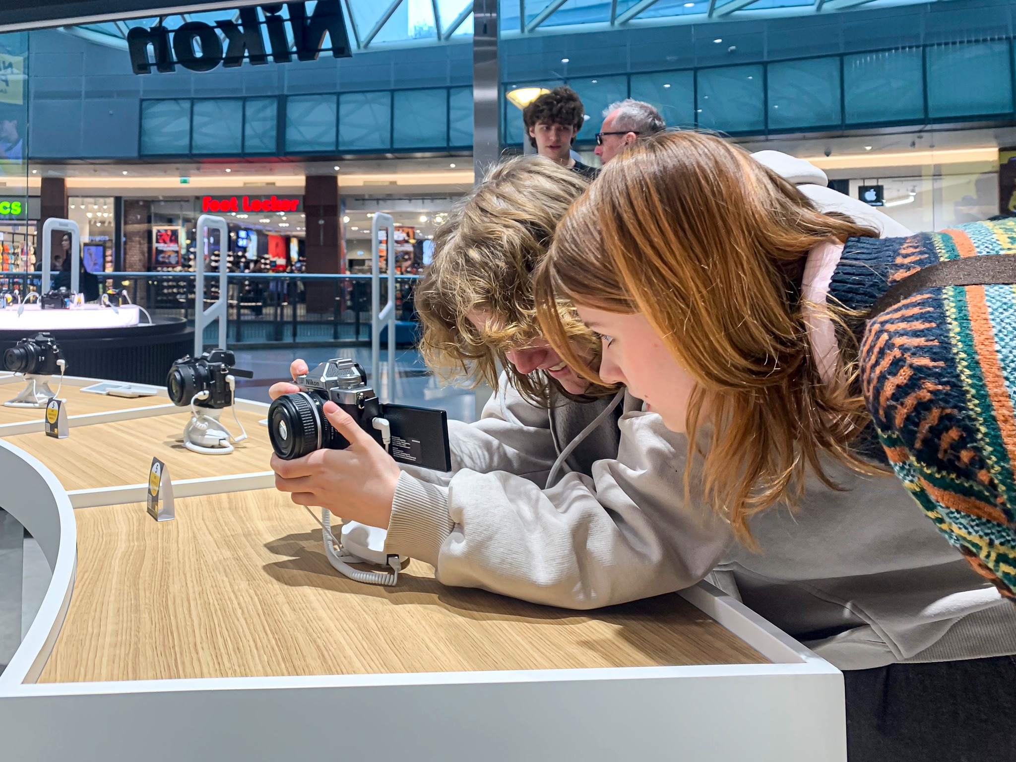 Istotnym elementem zajęć była możliwość praktycznego testowania sprzętu fotograficznego udostępnionego przez firmę Nikon. Uczniowie mogli pracować zarówno w sali szkoleniowej Nikon School, jak i w salonie, w strefie Touch & Try, gdzie sprawdzali różne modele aparatów oraz porównywali sprzęt pełno- i niepełnoklatkowy, m.in. Nikon Z50 oraz Nikon Z8. Szczególne zainteresowanie wzbudził najdłuższy istniejący obiektyw do aparatów Nikona, wykorzystywany w fotografii sportowej i przyrodniczej.