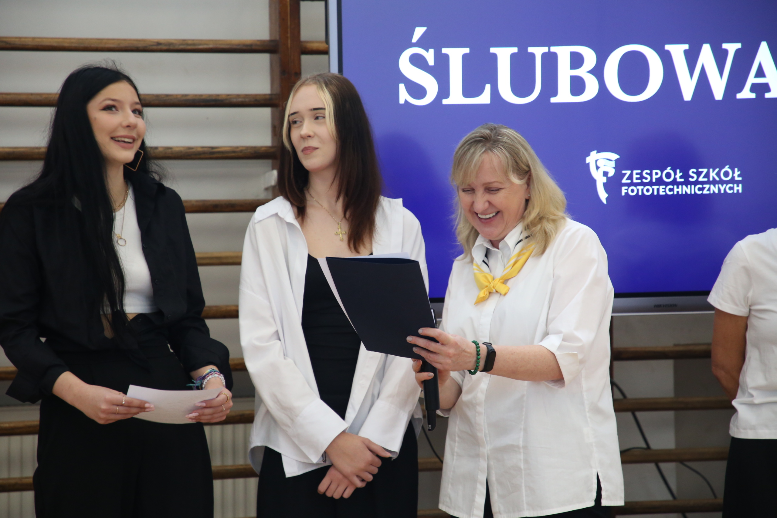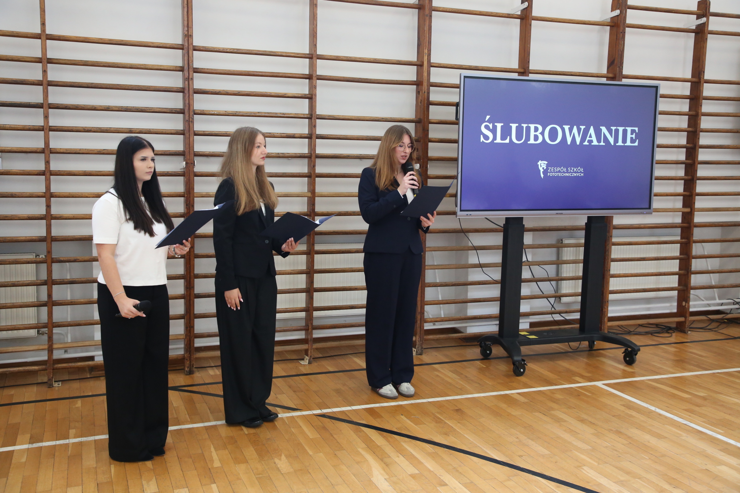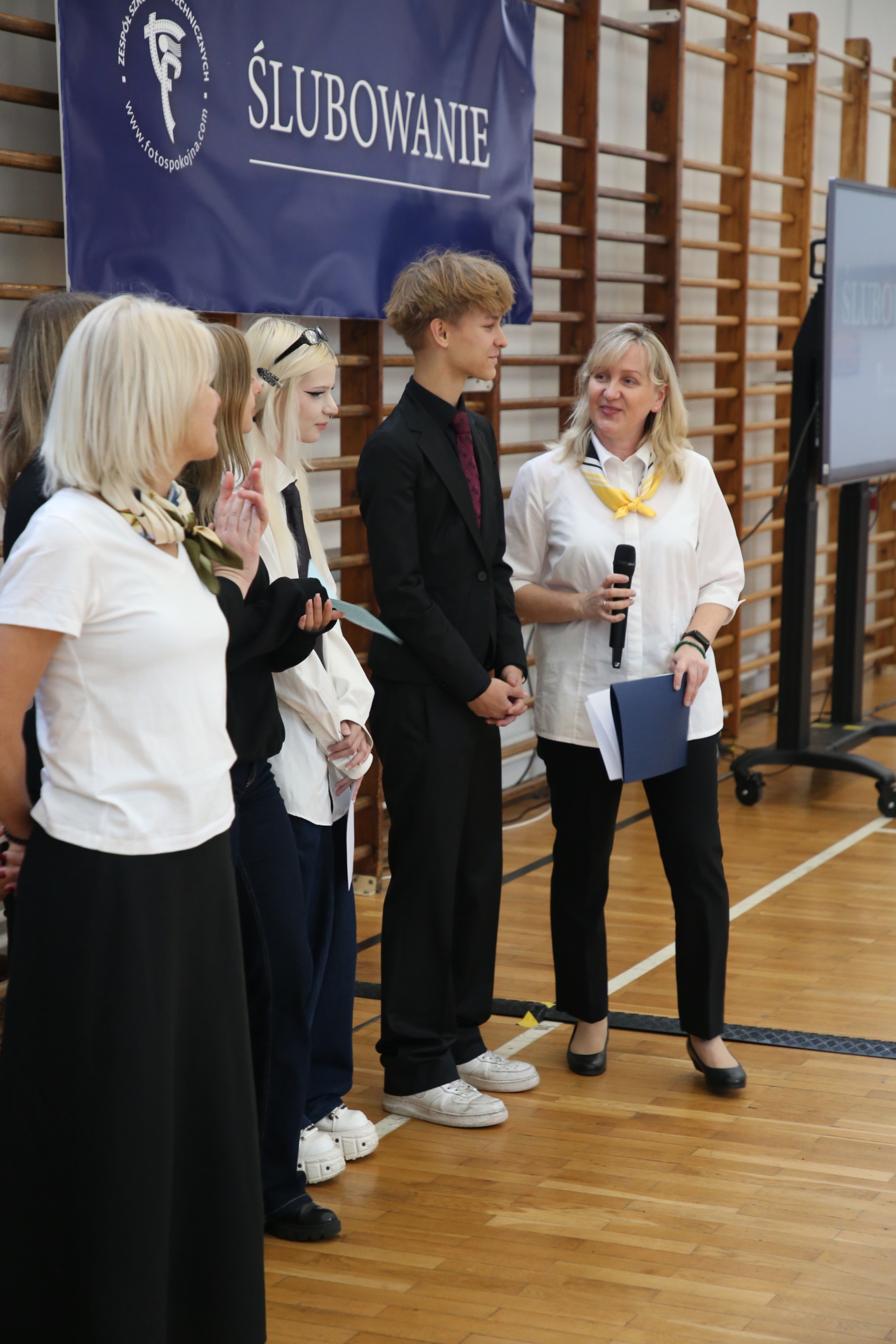 Kulminacyjnym momentem było złożenie ślubowania – przedstawiciele każdej klasy pierwszej złożyli uroczystą przysięgę przed sztandarem szkoły. Po zakończeniu ceremonii i wyprowadzeniu pocztu sztandarowego nastąpiła kolejna część spotkania – ogłoszenie wyników konkursu na rymowankę – (Nie)porozumienia- który odbywał się podczas zajęć integracyjnych na początku roku szkolnego. Siedmioro wyróżnionych uczniów zaprezentowało swoje utwory i odebrało symboliczne nagrody.