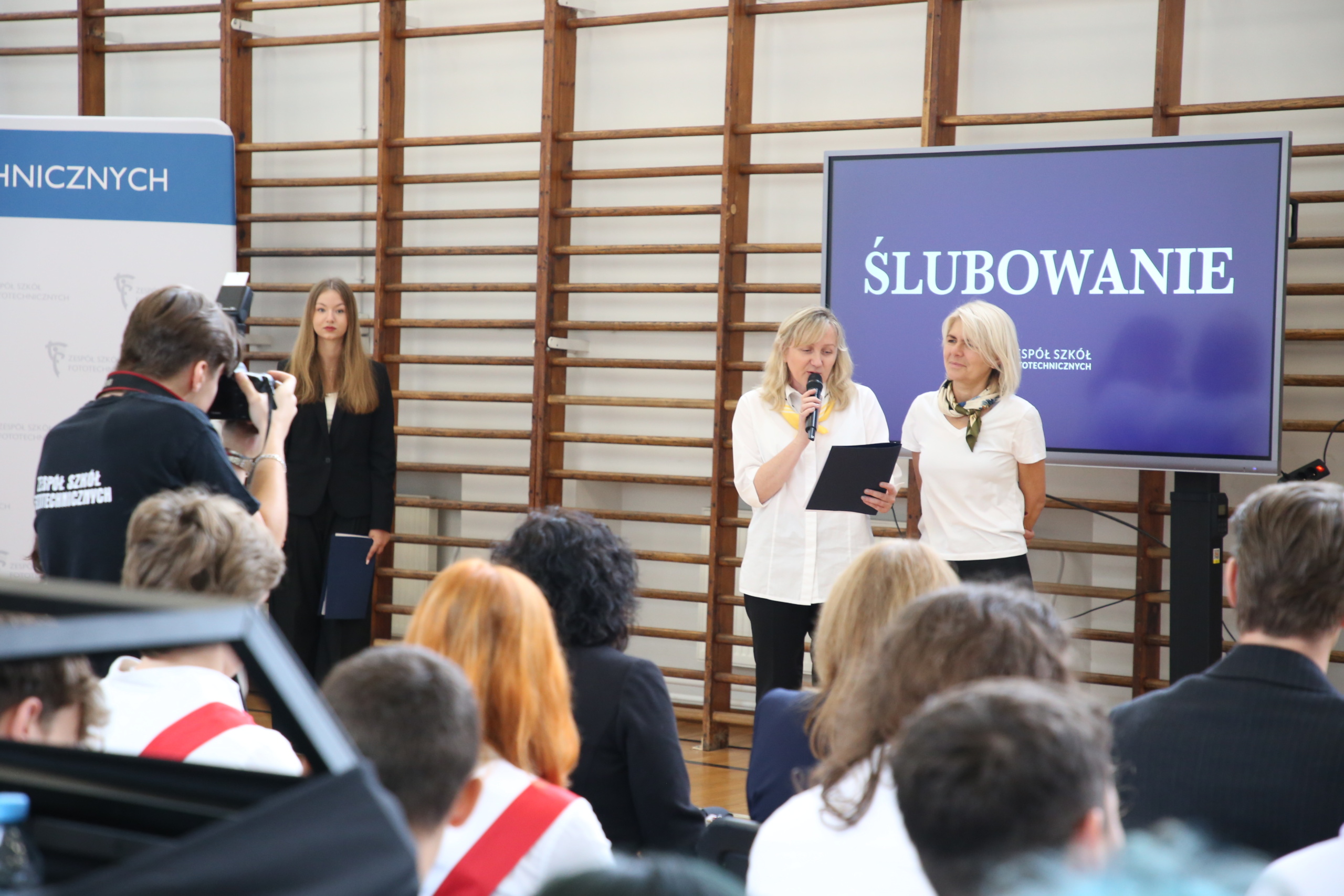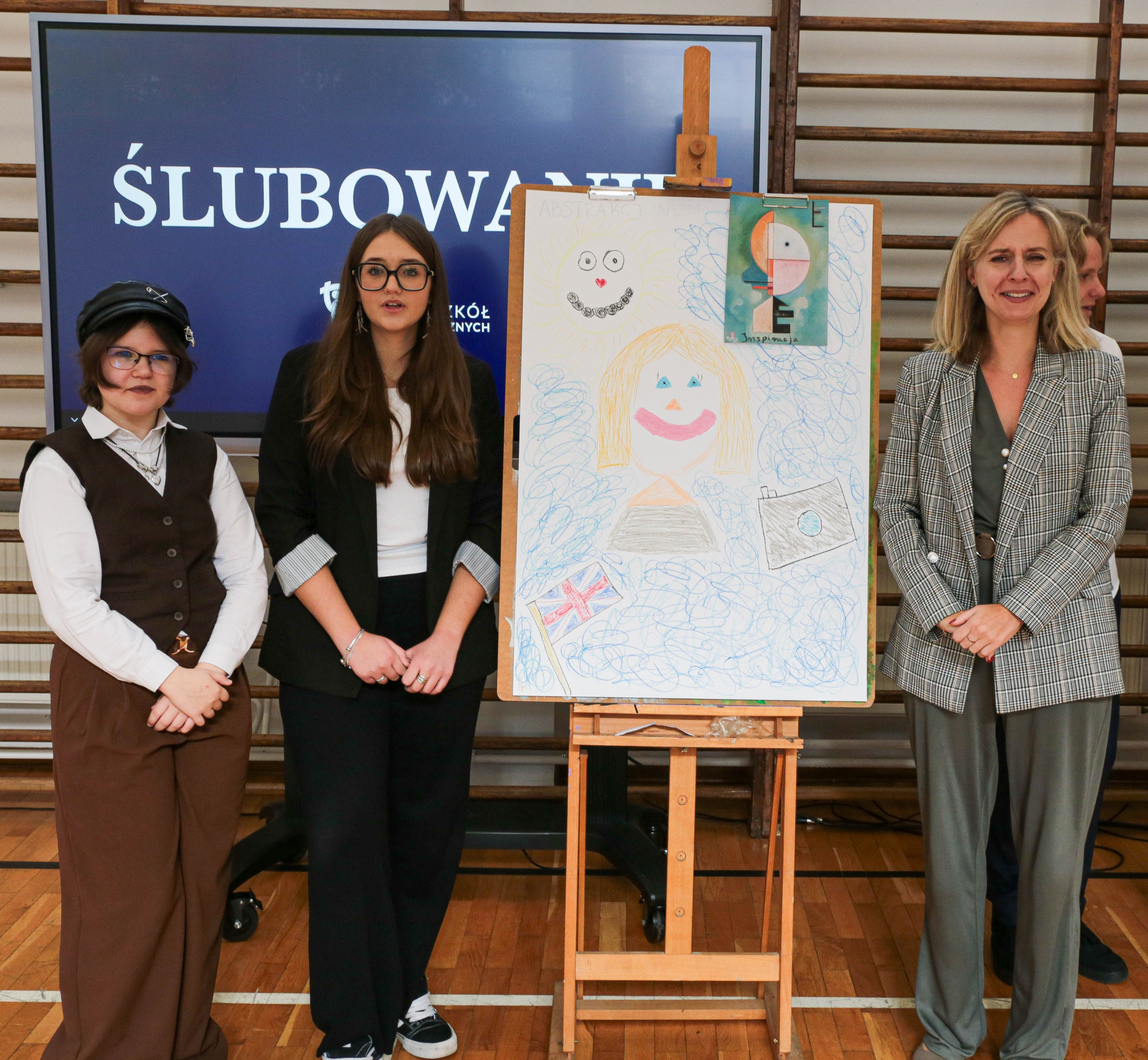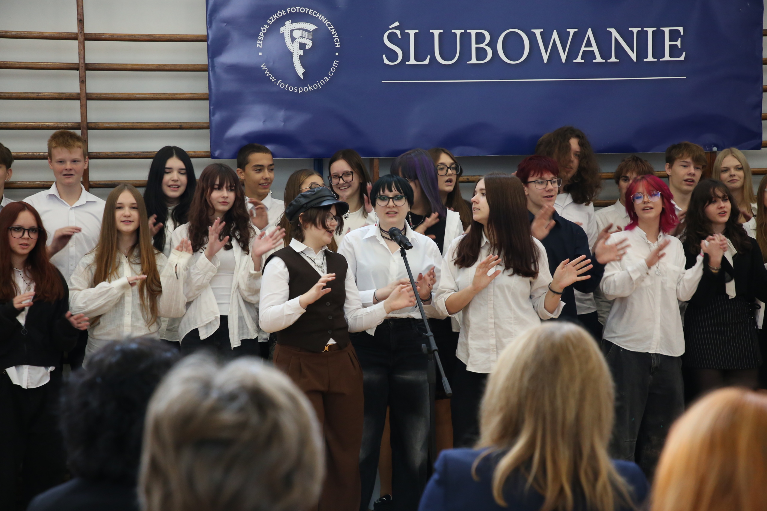 Kulminacyjnym momentem było złożenie ślubowania – przedstawiciele każdej klasy pierwszej złożyli uroczystą przysięgę przed sztandarem szkoły. Po zakończeniu ceremonii i wyprowadzeniu pocztu sztandarowego nastąpiła kolejna część spotkania – ogłoszenie wyników konkursu na rymowankę – (Nie)porozumienia- który odbywał się podczas zajęć integracyjnych na początku roku szkolnego. Siedmioro wyróżnionych uczniów zaprezentowało swoje utwory i odebrało symboliczne nagrody.