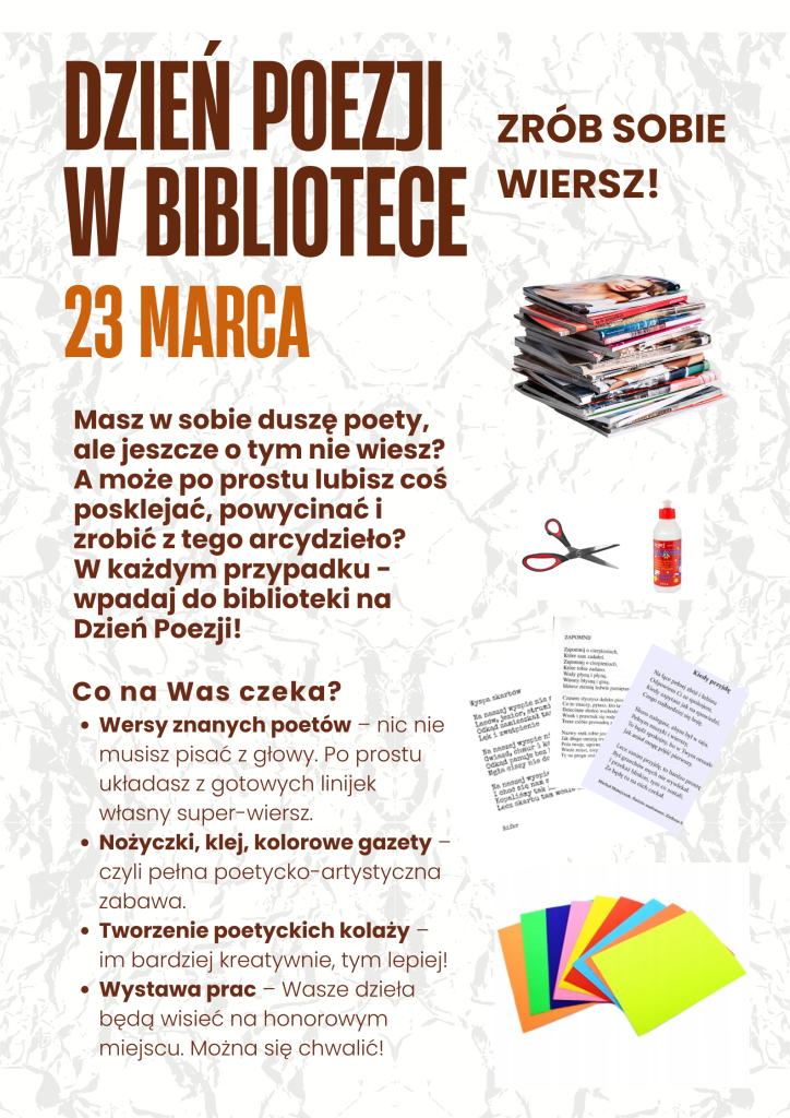 W czwartek, 21 marca zapraszamy do biblioteki na Dzień poezji. Tego dnia będziecie mogli stworzyć własny wiersz, korzystając z wersów uznanych polskich poetów i ozdobić go poetyckimi kolażami wykorzystując materiały z kolorowych gazet. Zapraszamy.